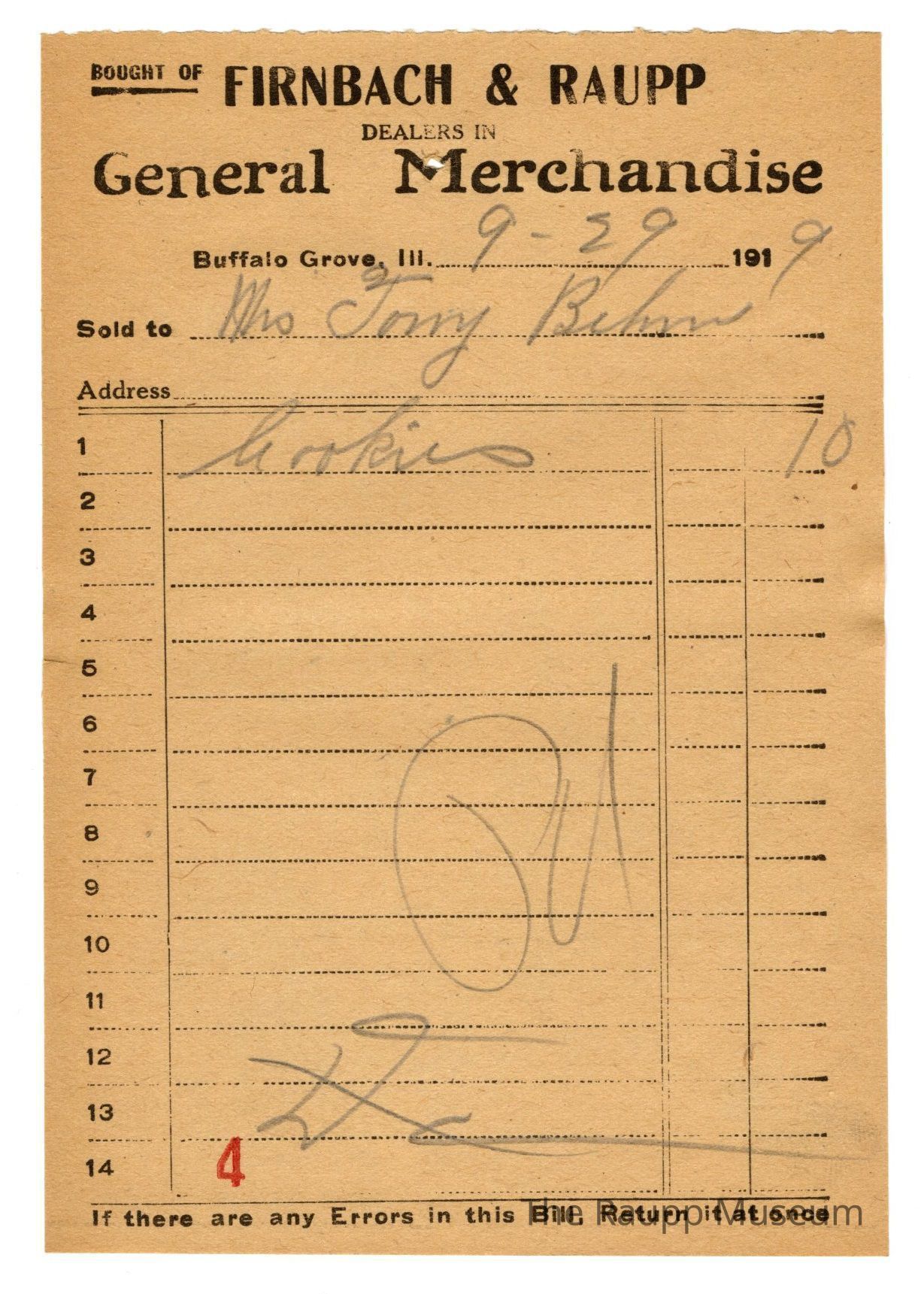 One (1) Firnbach and Raupp store receipt from 9/29/1919. Receipt recipient is Mrs. Tony Behm and has one (1) item purchased (one (1) cookies). Mrs. Tony Behm paid ten cents ($0.10). The letters Pd. (an abbreviation for paid) and indiscernible letters are written in the bottom center of the receipt. Receipt is rectangular, has black ink and is written in pencil. The top reads: BOUGHT OF (underlined and printed in capital letters); Firnbach & Raupp; DEALERS IN; GENERAL MERCHANDISE (printed in capital letters); Buffalo Grove Ill; Sold to; Address. The bottom reads: If there are any Errors in this Bill Return it at once. The number four (stamped as 4) is stamped in red ink at the bottom left of the page.Archive Details