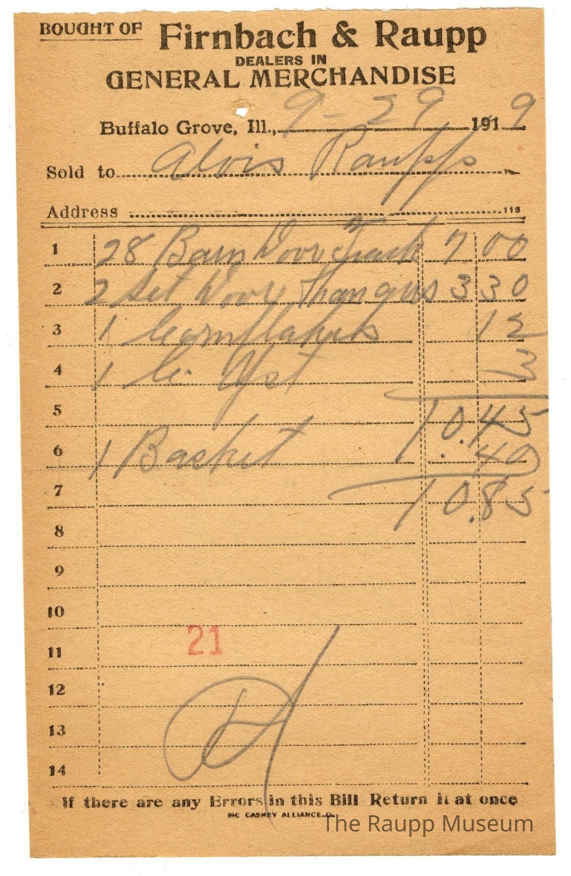 One (1) Firnbach and Raupp store receipt from 9/29/1919. Receipt recipient is Alois Raupp and has five (5) items purchased (twenty eight (28) Barn Door Track, two (2) ?, one (1) cornflakes, one (1) box (written as bx) yst, and one (1) basket. Alois Raupp's original bill was ten dollars and forty five cents ($10.45), but he added an additonal item so he paid ten dollars and eighty five cents ($10.85). The letters Pd. (an abbreviation for paid) are written in the bottom center of the receipt. Receipt is rectangular, has black ink and is written in pencil. The top reads: BOUGHT OF (underlined and printed in capital letters); Firnbach & Raupp; DEALERS IN; GENERAL MERCHANDISE (printed in capital letters); Buffalo Grove Ill; Sold to; Address. The bottom reads: If there are any Errors in this Bill Return it at once, MC CASKEY ALLIANCE O. (printed in capital letters). The number twenty one (stamped as 21) is stamped in red ink at the bottom center of the page.Archive Details