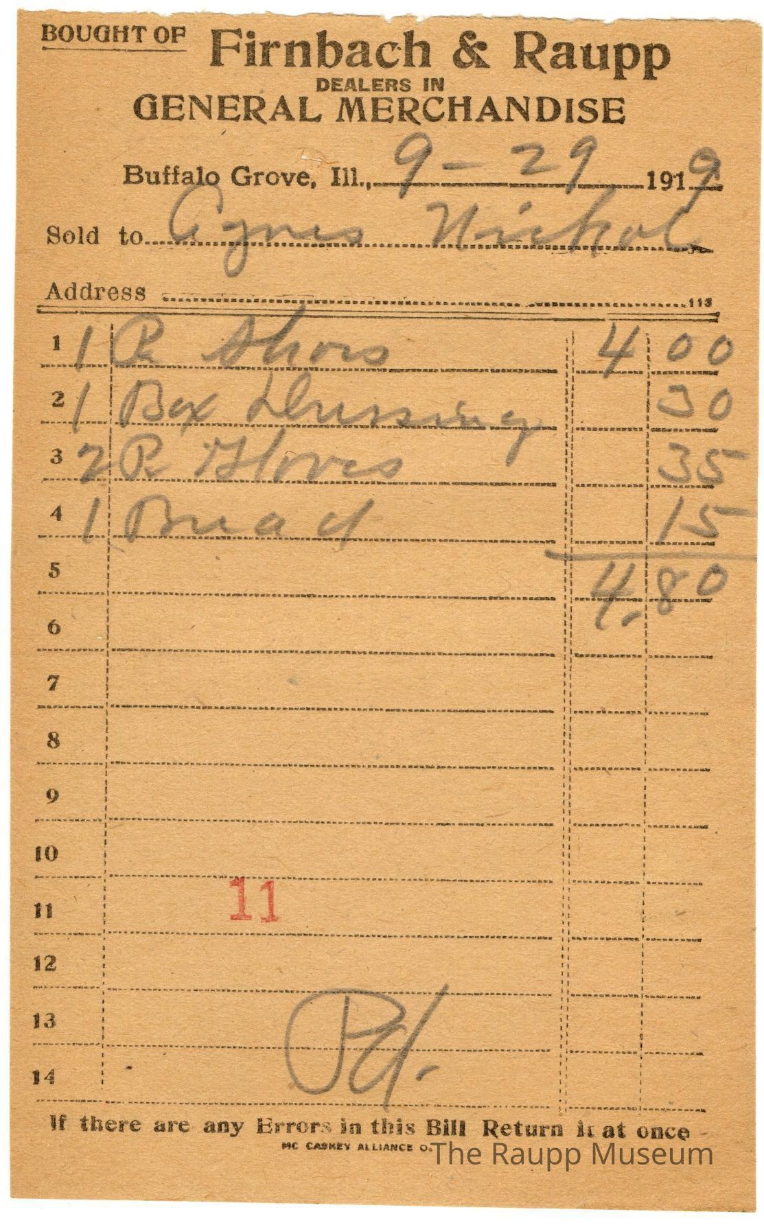 One (1) Firnbach and Raupp store receipt from 9/29/1919. Receipt recipient is Agnes Nichol and has four (4) items purchased (one (1) pair shoes (written as Pr), one (1) box (written as Bx) unknown, two (2) pair (written as Pr) gloves, one (1) bread). Agnes Nichol paid four dollars and eighty cents ($4.80). The letters Pd. (an abbreviation for paid) are written in the bottom center of the receipt. Receipt is rectangular, has black ink and is written in pencil. The top reads: BOUGHT OF (underlined and printed in capital letters); Firnbach & Raupp; DEALERS IN; GENERAL MERCHANDISE (printed in capital letters); Buffalo Grove Ill; Sold to; Address. The bottom reads: If there are any Errors in this Bill Return it at once, MC CASKEY ALLIANCE O. (printed in capital letters). The number eleven (stamped as 11) is stamped in red ink at the bottom center of the page.Archive Details