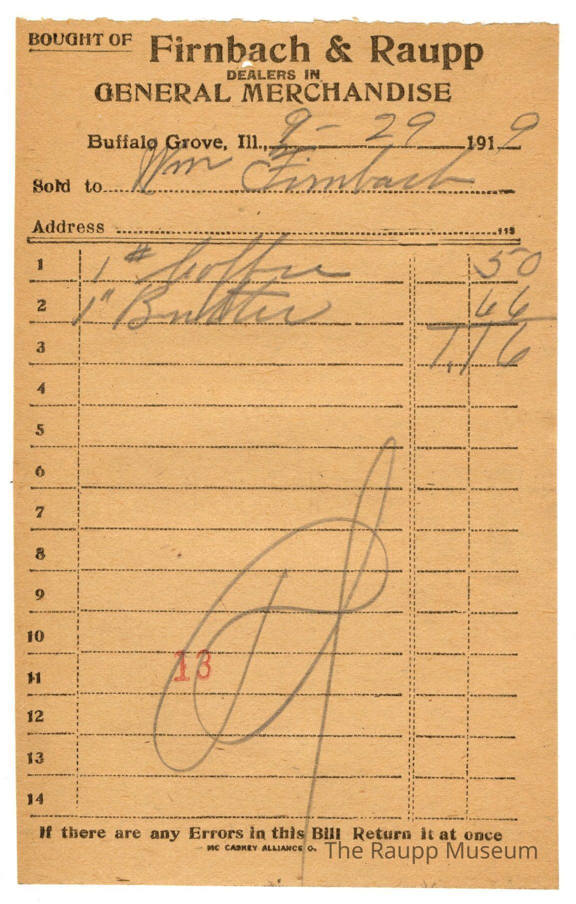 One (1) Firnbach and Raupp store receipt from 9/29/1919. Receipt recipient is Wm. (William) Firnbach and has two (2) items purchased (one (1) pound (written as #) coffee, one (1) pound (written as #) butter). Wm. (William) Firnbach paid one dollar and sixteen cents ($1.16). The letters Pd (an abbreviation for paid) are written in pencil in the bottom center of the receipt. Receipt is rectangular, has black ink and is written in pencil. The top reads: BOUGHT OF (underlined and printed in capital letters); Firnbach & Raupp; DEALERS IN; GENERAL MERCHANDISE (printed in capital letters); Buffalo Grove Ill; Sold to; Address. The bottom reads: If there are any Errors in this Bill Return it at once, MC CASKEY ALLIANCE Co (printed in capital letters). The number thirteen (stamped as 13) is stamped in red ink at the bottom center of the page.Archive Details