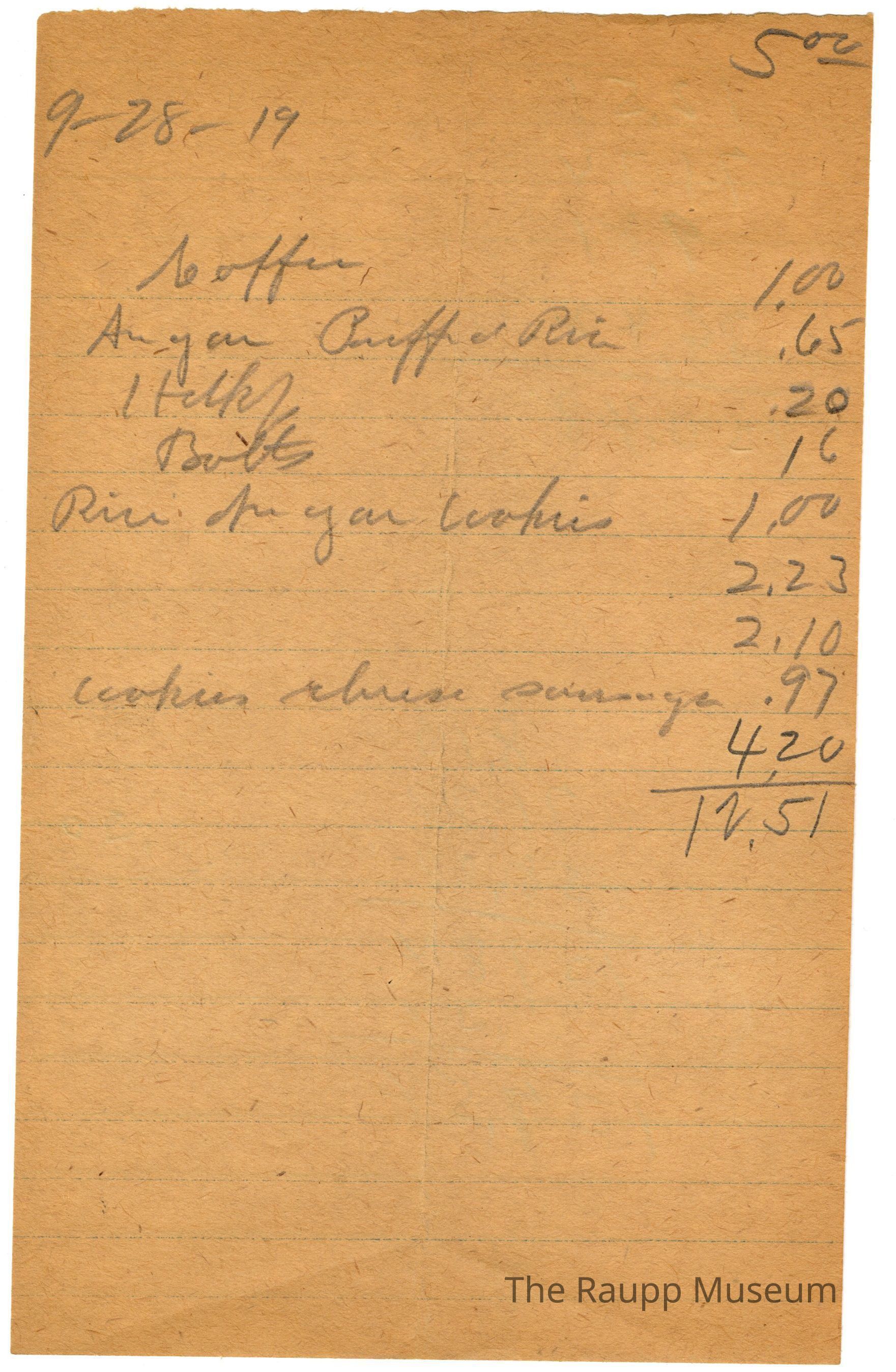 One (1) Firnbach and Raupp store receipt from 9/28/1919. Receipt recipient is unknown and has six (6) items purchased (one (1) coffee, one (1) sugar, one (1) unknown, one (1) bolts, one (1) ? sugar cookies, one (1) cookies, cheese, orange?). Unknown's bill was twelve dollars and fifty one cents ($12.51). The number five (5) with two superscripted zeros (00) is written in the top right corner. There are two math equations on the back of the sheet with the sums of one hundred thirty and forty eight (130.48) and one hundred thirty seven and fifty four (137.57). Receipt is rectangular, has blue ink and is written in pencil. On the back of the receiptArchive Details