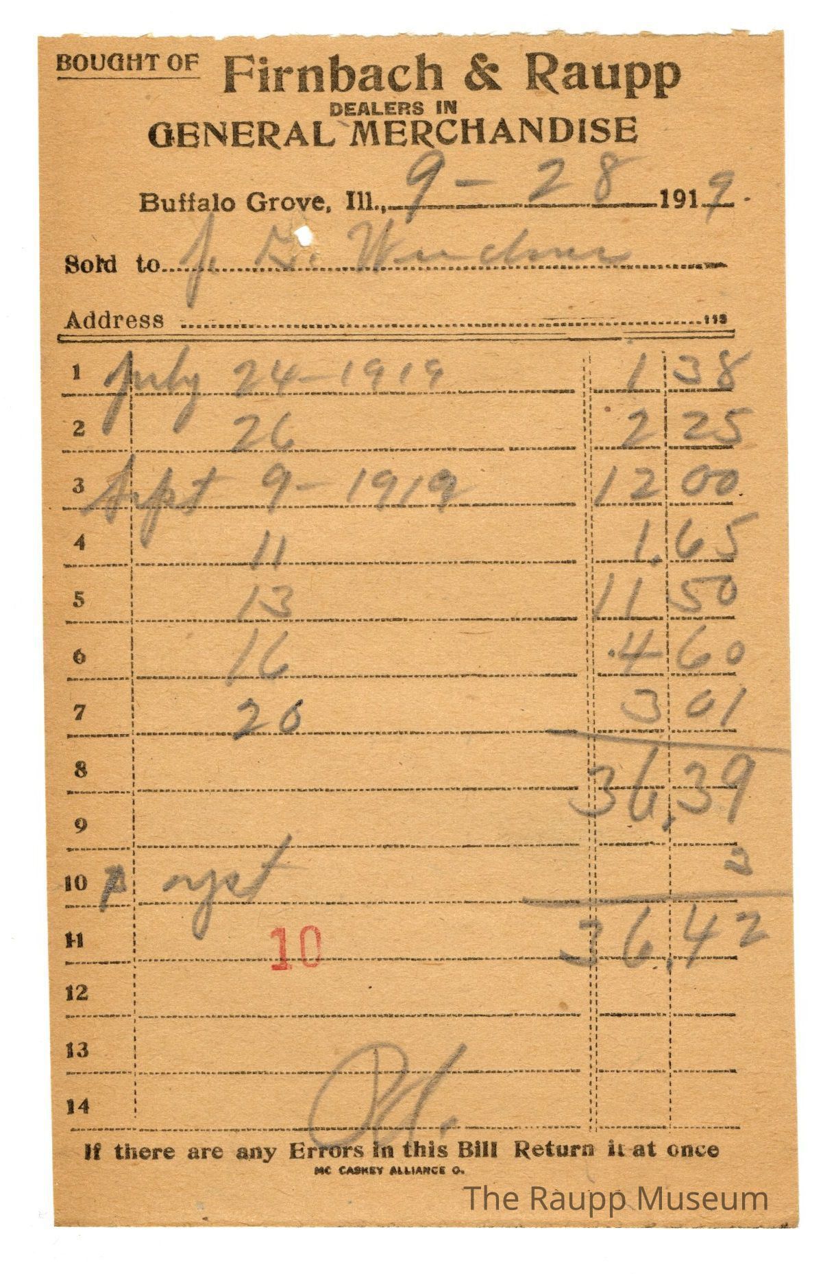 One (1) Firnbach and Raupp store receipt from 9/28/1919. Receipt recipient is J. G. Weidner and has eight (8) items purchased (one (1) bill from July 24,1919, one (1) bill from July 26, 1919, one (1) September 9, 1919, one (1) September 11, 1919, one (1) September 13, 1919, one (1) September 16, 1919, one (1) September 20, 1919, and one (1) yeast). J. G. Weidner paid thirty six dollars and forty two cents ($36.42). The letters Pd (an abbreviation for paid) are written in pencil in the bottom center of the receipt. Receipt is rectangular, has black ink and is written in pencil. The top reads: BOUGHT OF (underlined and printed in capital letters); Firnbach & Raupp; DEALERS IN; GENERAL MERCHANDISE (printed in capital letters); Buffalo Grove Ill; Sold to; Address. The bottom reads: If there are any Errors in this Bill Return it at once, MC CASKEY ALLIANCE O. (printed in capital letters). The number ten (stamped as 10) is stamped in red ink at the bottom center of the page.Archive Details