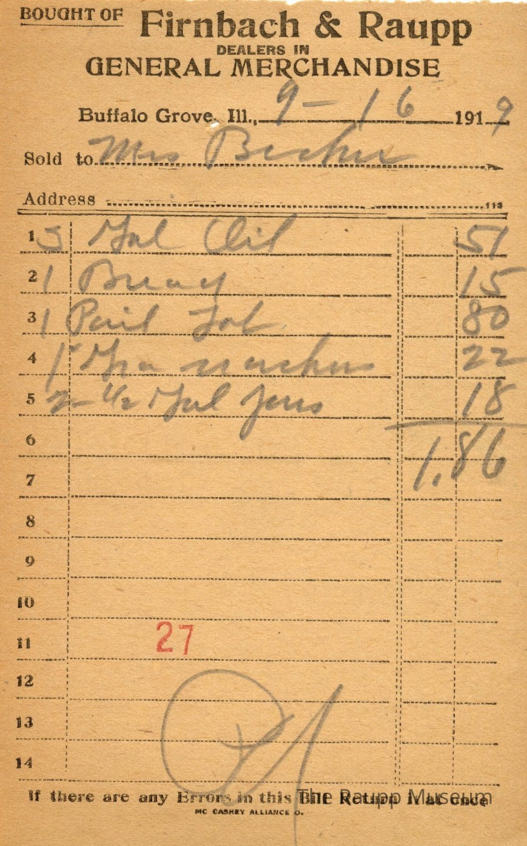 One (1) Firnbach and Raupp store receipt from September 16 1919. Receipt is for Mrs. Becker, and has five (5) items purchased. Purchased items included (?) gal oil, one (1) bread, one (1) pail job (?), one (1) graham crackers, and two and a half (2 1/2) gal jars. Total was $1.86. Receipt is rectangular, with both printed and handwritten text. On the top is printed "Firnbach & Raupp Dealers In General Merchandise." PD is handwritten on the bottom, and a red 27 is stamped at the center bottom.Archive Details