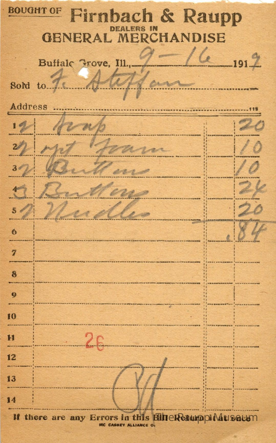 One (1) Firnbach and Raupp store receipt from September 16 1919. Receipt is for F. Steffan, and has five (5) items. Purchased items included two (2) soap, two (2) yeast foam, two (2) buttons, three (3) buttons, two (2) needles. Total was $.84. Receipt is rectangular, with both printed and handwritten text. On the top is printed "Firnbach & Raupp Dealers In General Merchandise." PD is handwritten on the bottom, and a red 26 is stamped at the center bottom.Archive Details