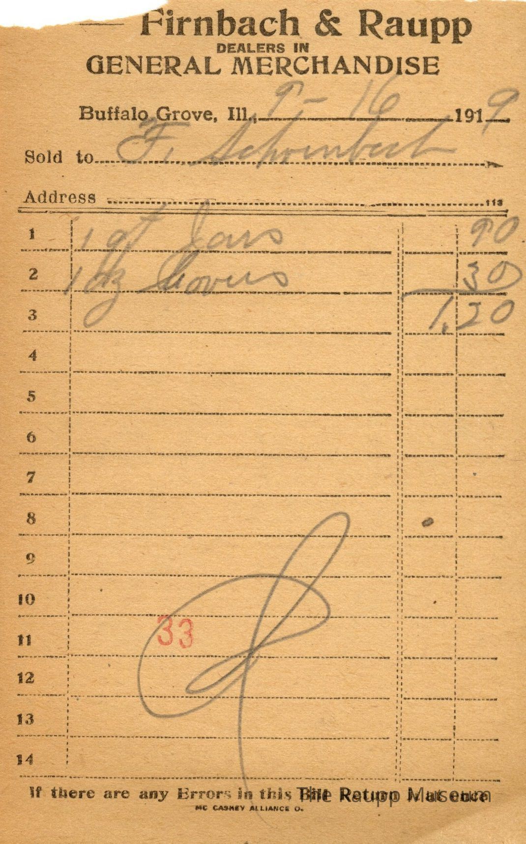 One (1) Firnbach and Raupp store receipt from September 16 1919. Receipt is for F. Schoenbech, and has two (2) items. Purchased items included one (1) qt jars and one (1) dozen covers.. Total was $1.20. Receipt is rectangular, with both printed and handwritten text. On the top is printed "Firnbach & Raupp Dealers In General Merchandise." PD is handwritten on the bottom, and a red 33 is stamped at the center bottom.Archive Details