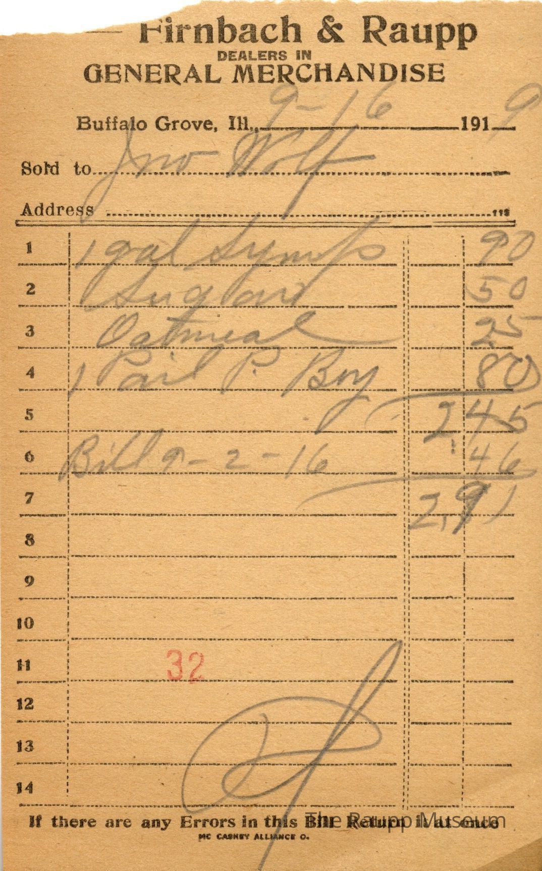 One (1) Firnbach and Raupp store receipt from September 16 1919. Receipt is for Jim Wolf, and has four (4) items purchased, as well as a bill from September 02 paid. Purchased items included one (1) gal syrup, sugar, oatmeal, and one (1) Pail P. Boy. Total was $2.91. Receipt is rectangular, with both printed and handwritten text. On the top is printed "Firnbach & Raupp Dealers In General Merchandise." PD is handwritten on the bottom, and a red 32 is stamped at the center bottom.Archive Details