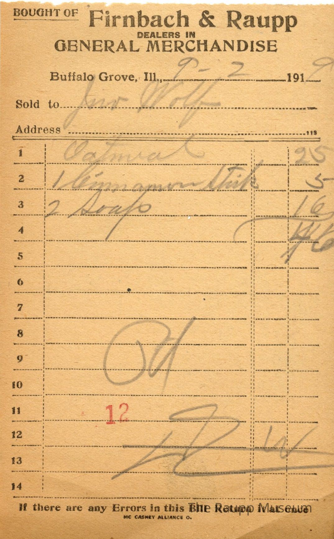 One (1) Firnbach and Raupp store receipt from September 02 1919. Receipt is for Jim Wolf, and has three (3) items purchased. Purchased items included oatmeal, one (1) cinnamon stick, and two (2) soap. Total was $.46. Receipt is rectangular, with both printed and handwritten text. On the top is printed "Firnbach & Raupp Dealers In General Merchandise." PD is handwritten on the bottom, and a red 12 is stamped at the center bottom.Archive Details