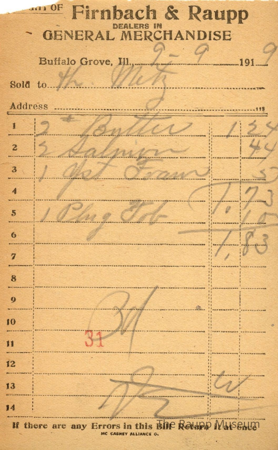 One (1) Firnbach and Raupp store receipt from September 09 1919. Receipt is for H. Metz, and has four (4) items purchased. Purchased items included two (2) # butter, two (2) salmon, one (1) yeast foam, and one (1) plug job. Total was $1.83. Receipt is rectangular, with both printed and handwritten text. On the top is printed "Firnbach & Raupp Dealers In General Merchandise." PD is handwritten on the bottom, and a red 31 is stamped at the center bottom.Archive Details