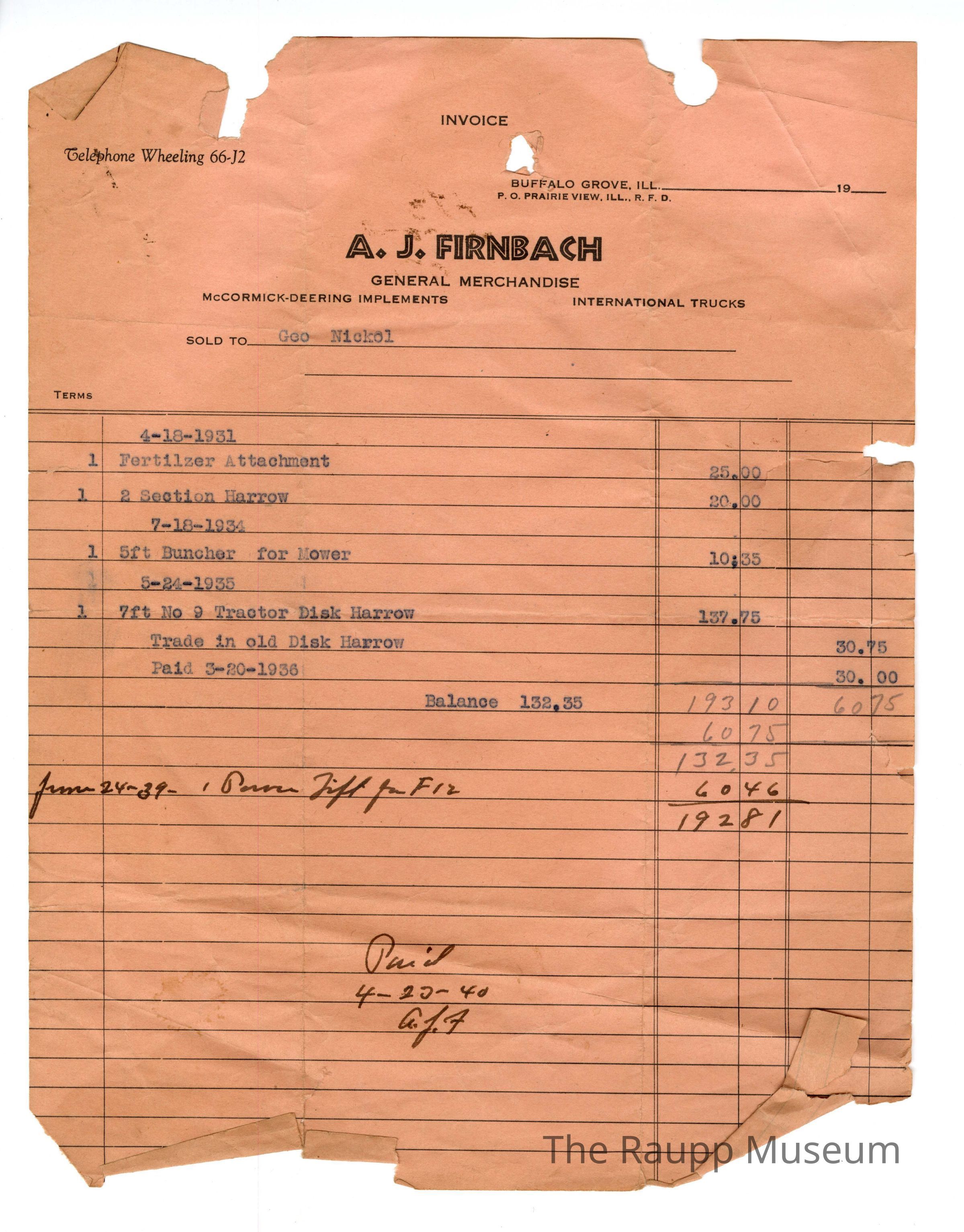 One (1) red rectangular receipt from AJ Firnbach to Geo Nickol on April 23, 1940. Receipt contains preprinted, typed, and handwritten portions is brown ink. Contains pieces bought 4/18/1931, 7/18/1934, and 5/24/1935, including fertilizer attachment, 2 section harrow, 5ft buncher for mower and 7ft No. 9 tractor Disk Harrow. After tax and a trade-in, the total was $192.81.