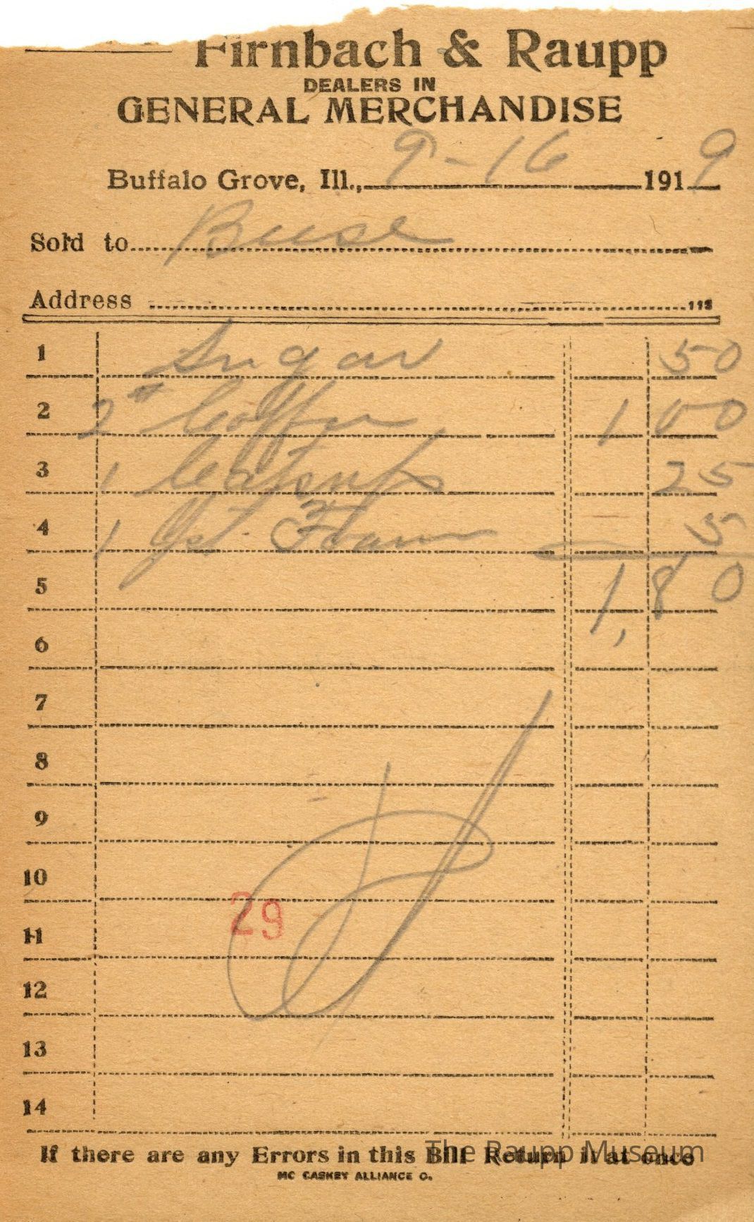 One (1) Firnbach and Raupp store receipt from September 16 1919. Receipt is for Beese, and has four (4) items purchased. Purchased items include sugar, two (2) # coffee, one (1) (?), and one (1) yeast foam. Total was $1.80. Receipt is rectangular, with both printed and handwritten text. On the top is printed "Firnbach & Raupp Dealers In General Merchandise." PD is handwritten on the bottom, and a red 29 is stamped at the center bottom.Archive Details