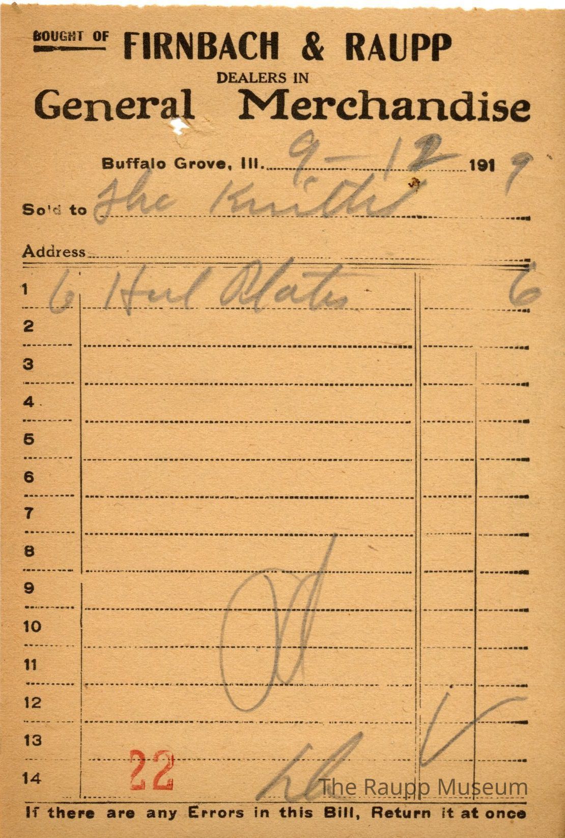 One (1) Firnbach and Raupp store receipt from September 12 1919. Receipt is for Theo Shnittel, and has one (1) items purchased. Purchased items include six (6) (?) plates. Total was $.06 (?). Receipt is rectangular, with both printed and handwritten text. On the top is printed "Firnbach & Raupp Dealers In General Merchandise." PD is handwritten on the bottom, and a red 22 is stamped bottom left.Archive Details