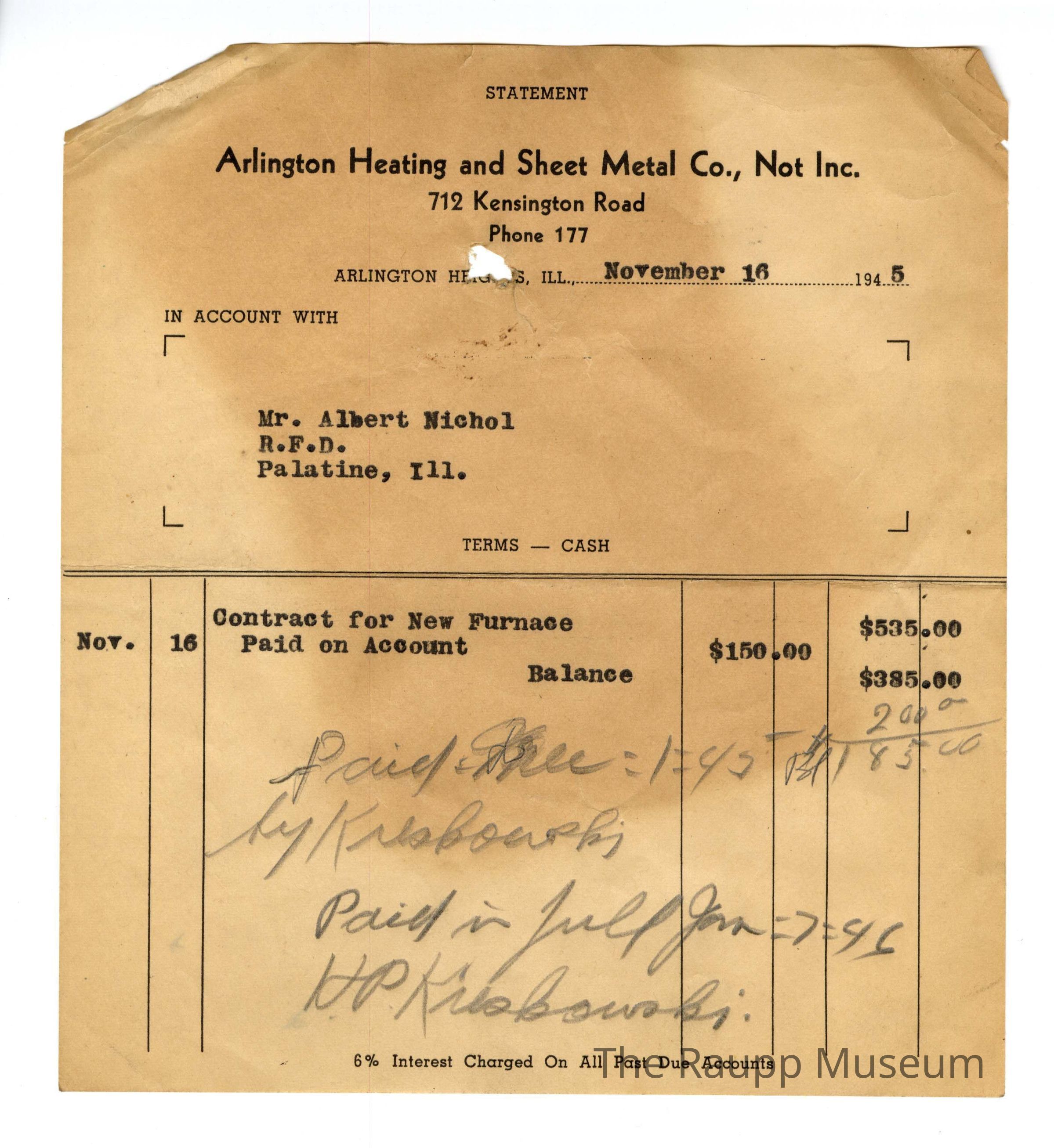 One (1) Arlington Heating and Sheet Metal Co., Not Inc receipt for Mr. Albert Nichol on November 16, 1945. Contains pre-printed text at the top, with typed description of work, including "Contract for New Furnace" for $535.00. There is some handwritten notes in pencil about the transaction on the bottom with HP Krebouski (?) signature.