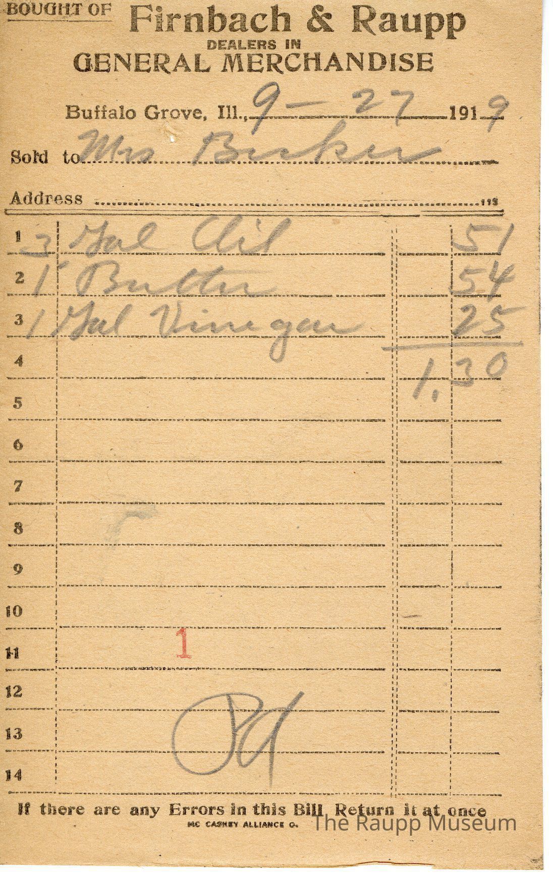 One (1) Firnbach and Raupp store receipt from September 27, 1919. Receipt is rectangular with black printed text and written notes in pencil. The receipt is for Mrs. Becker, who bought three gallons of oil for $0.51, one button for $0.54, and one gallon of vinegar for $0.25. Bill total is $1.30. There's a red stamp of 1 close to the bottom, with the bill marked as paid.