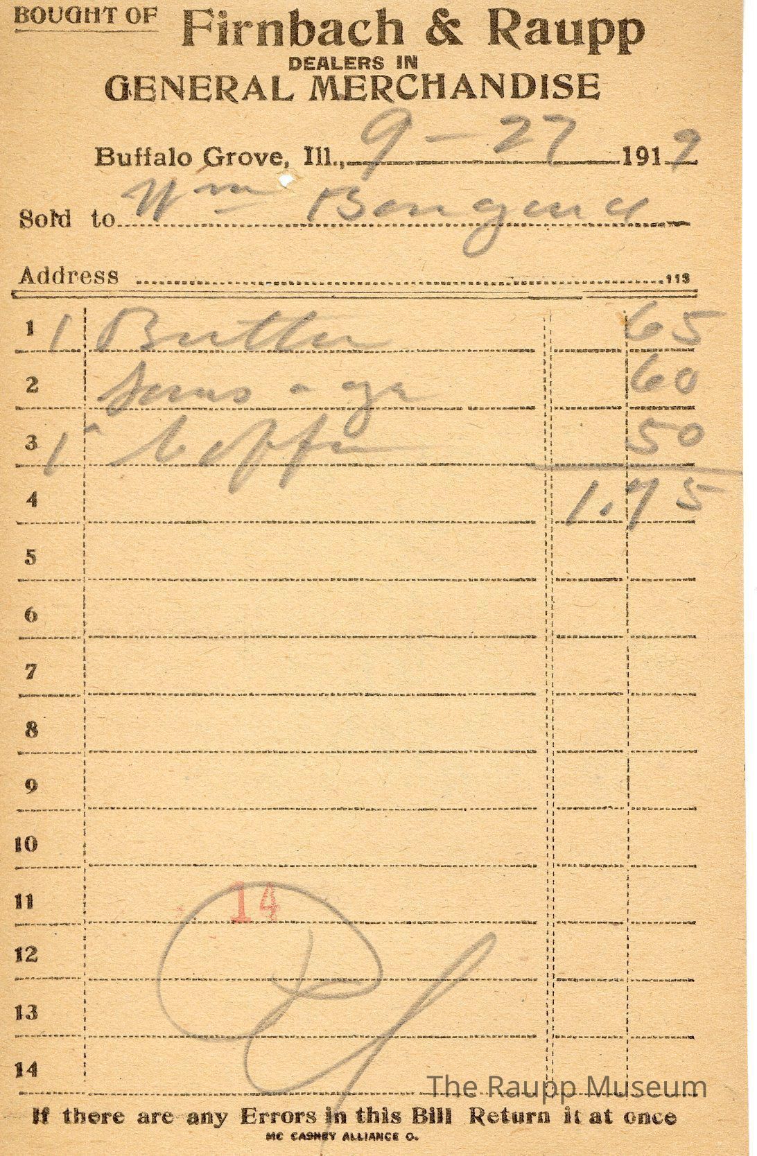 The black text is as follows, from top to bottom: Bought of Firnbach & Raupp; Dealers in GENERAL MERCHANDISE; Buffalo Grove, Ill.; Sold to; Address; If there are any Errors in this Bill Return it at once; MC CASKEY ALLIANCE O.Archive Details
