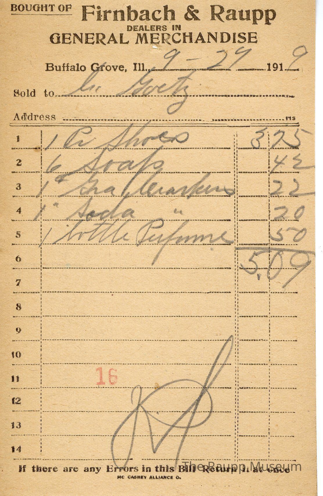 One (1) Firnbach and Raupp store receipt from September 29, 1919. Receipt is rectangular with black printed text and written notes in pencil. The receipt is for L. Goetz (?), who bought one pair of shoes for $3.75, six srap (?) for $0.42, one pound of graham crackers for $0.22, one pound of soda for $0.20, and one bottle of perfume for $0.50. The bill total is $5.09. There's a red stamp of 16 towards the bottom and the bill is marked as paid.