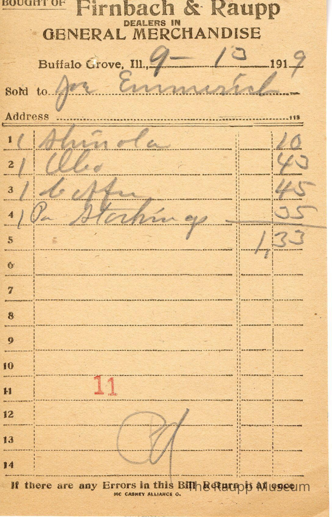 One (1) Firnbach and Raupp store receipt from September 13, 1919. Receipt is rectangular with black printed text and written notes in pencil. The receipt is for Joe Emmerich, who bought one shinola dor $0.10, one oleo for $0.43, one coffee for $0.45, and one pair of stockings for $0.35. The bill total is $1.33. There's a red stamp of 11 towards the bottom and the bill is marked as paid.