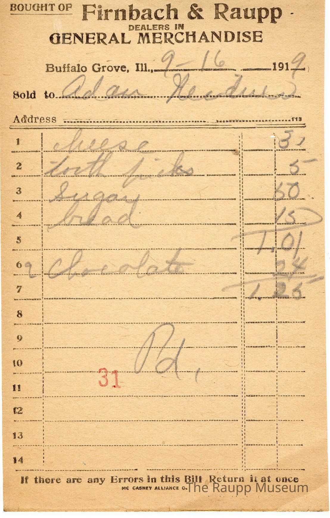 One (1) Firnbach and Raupp store receipt from September 16, 1919. Receipt is rectangular with black printed text and written notes in pencil. The receipt is for Adam Keedner (?), who bought cheese for $0.31, toothpicks for $0.05, sugar for $0.50, bread for $0.15, and two chocolates for $0.24. Bill total is $1.25. There's a red stamp of 31 close to the bottom and the bill is marked as paid.