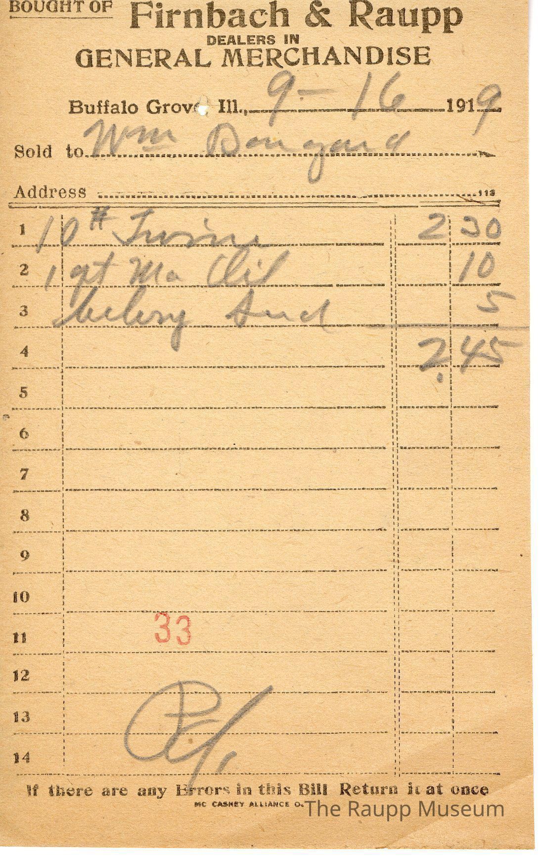 The black text is as follows, from top to bottom: Bought of Firnbach & Raupp; Dealers in GENERAL MERCHANDISE; Buffalo Grove, Ill.; Sold to; Address; If there are any Errors in this Bill Return it at once; MC CASKEY ALLIANCE O.Archive Details