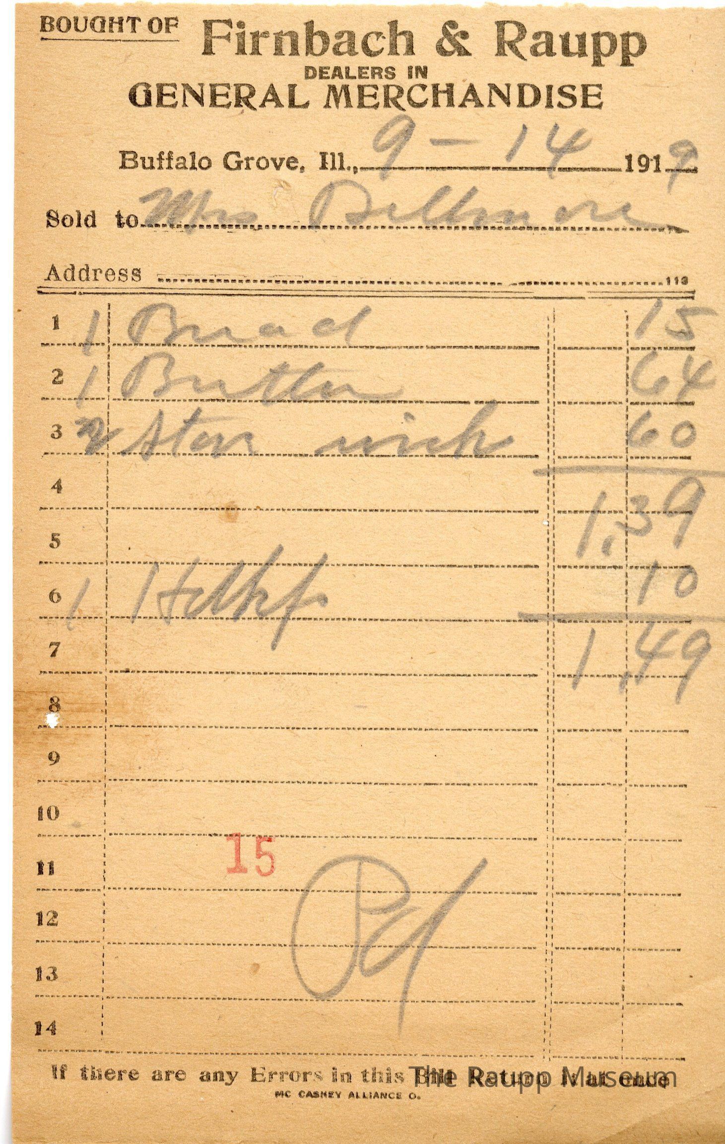 One (1) Firnbach and Raupp store receipt from September 14, 1919. Receipt is rectangular with black printed text and written notes in pencil. The receipt is for Mrs. Dellmore, who bought one bread for $0.15, one butter for $0.64, and 2 star wich (?) for $0.60, and one helkfo (?) for $0.10. Bill total is $1.49. There's a red stamp of 15 close to the bottom with the bill marked as paid.
