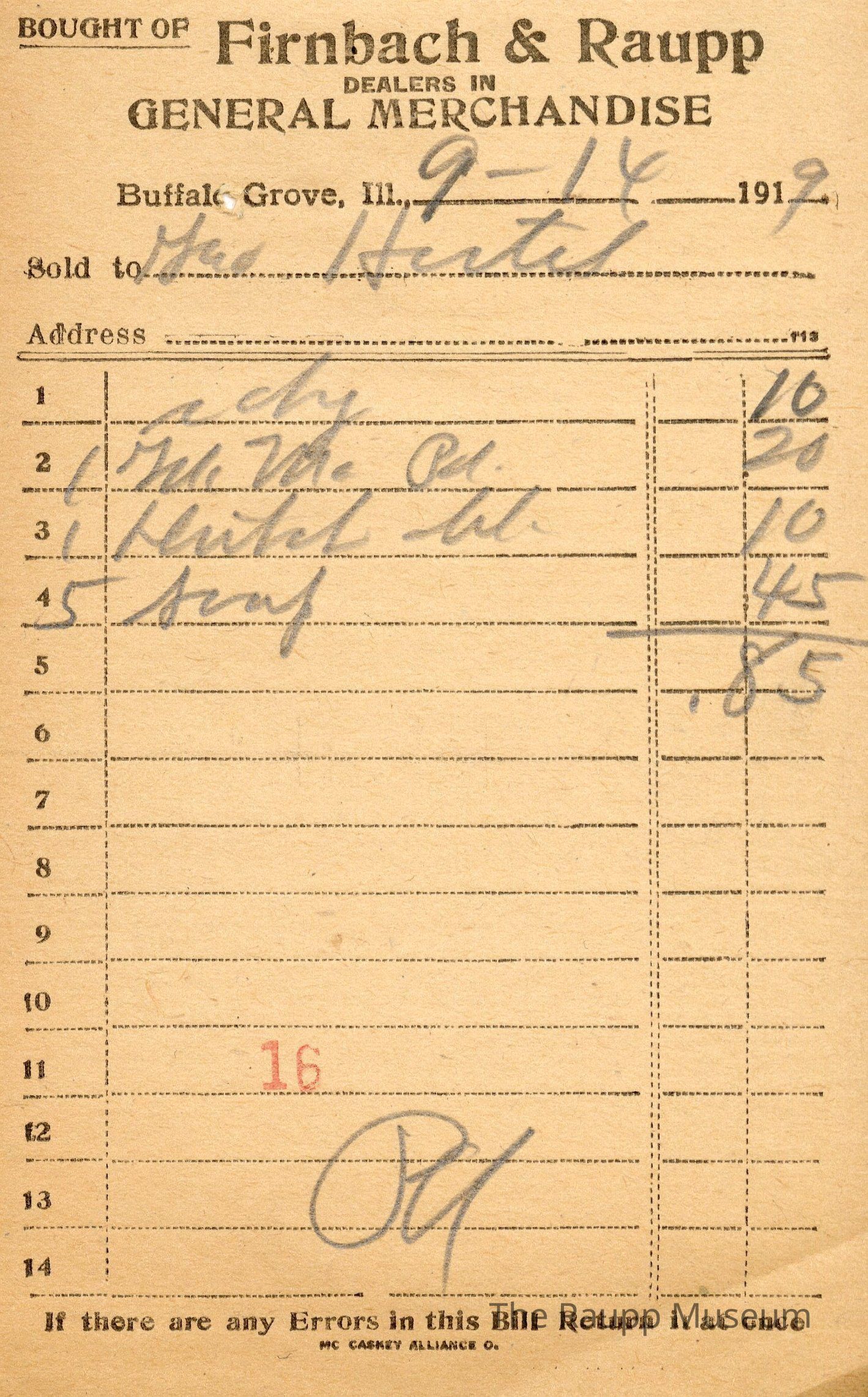 One (1) Firnbach and Raupp store receipt from September 14, 1919. Receipt is rectangular with black printed text and written notes in pencil. The receipt is for Geo. Hertel, who bought e dy. (?) for $0.10, one yd. Ma. Pd. (?) for $0.20, one hutel ld. (?) for $0.10. and five soaps for $0.45. Bill total is $0.85. There's a red stamp of 16 close to the bottom with the bill marked as paid.