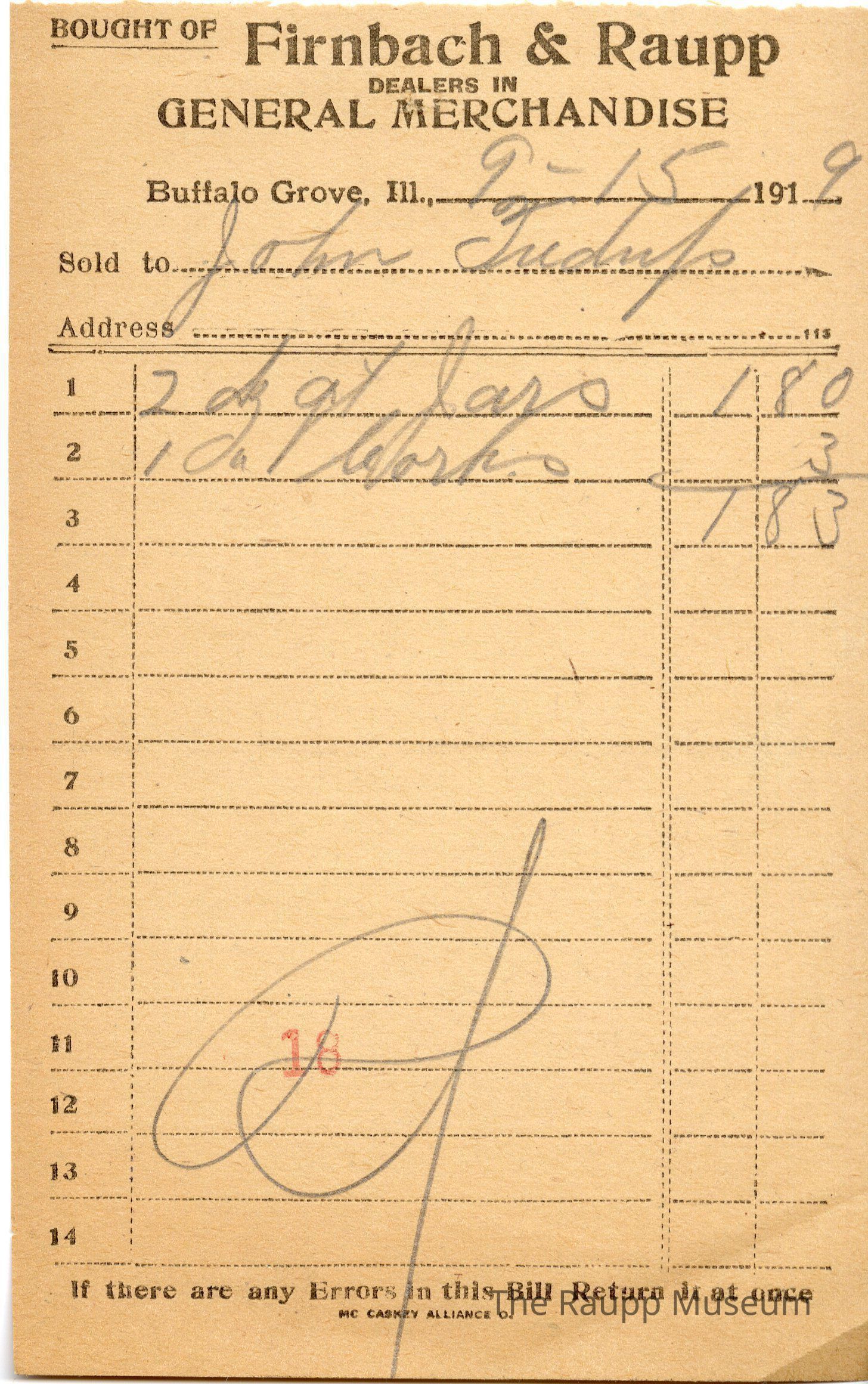 The black text is as follows, from top to bottom: Bought of Firnbach & Raupp; Dealers in GENERAL MERCHANDISE; Buffalo Grove, Ill.; Sold to; Address; If there are any Errors in this Bill Return it at once; MC CASKEY ALLIANCE O.Archive Details