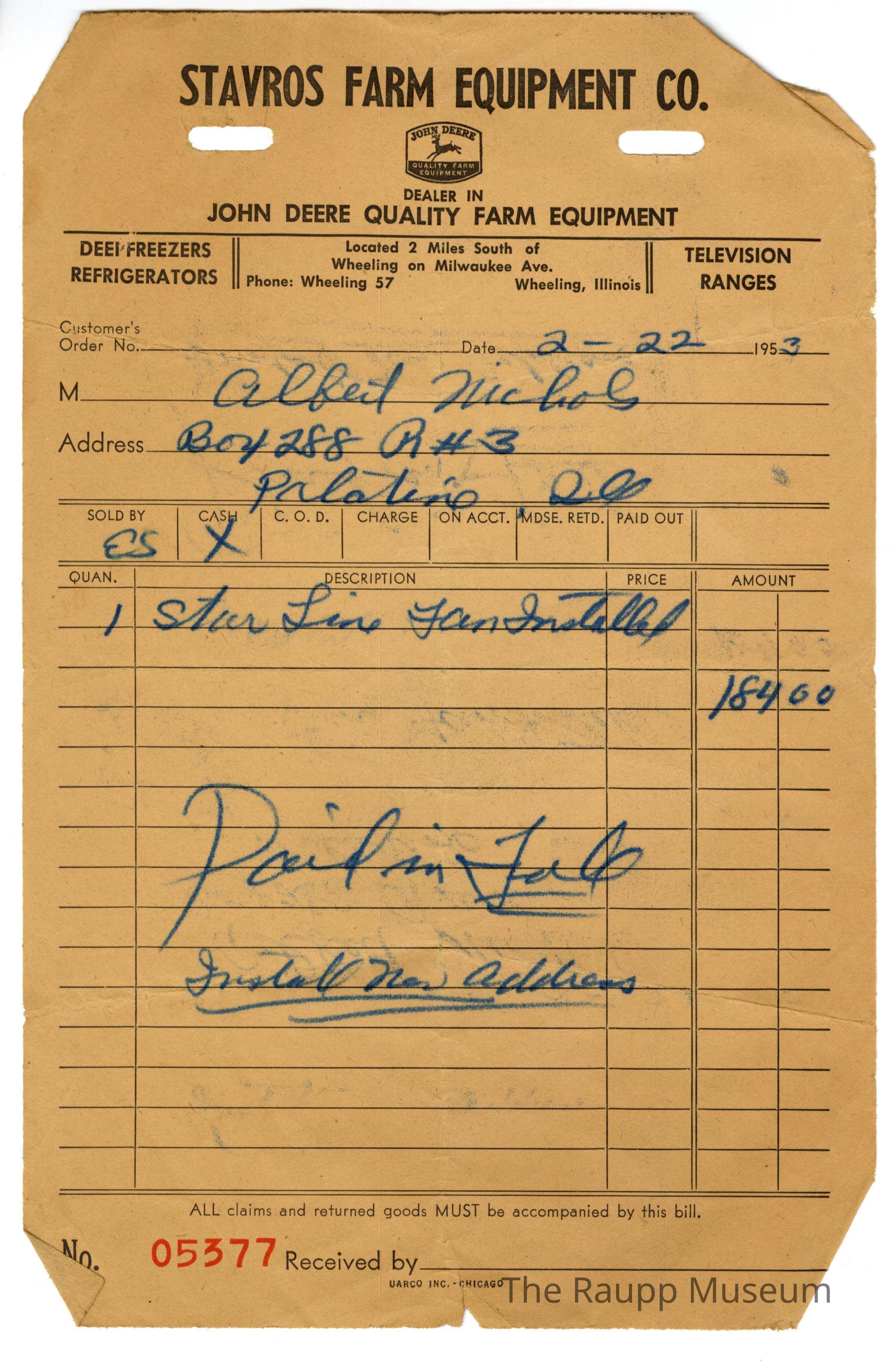 One (1) brown rectangular receipt from Stravos Farm Equipment Co. in Wheeling, Illinois. Receipt is for Albert Nickols for "1 Star line Fan Installed" for $184.00, dated 2/22/1953. Receipt has preprinted text and handwritten text in pencil.