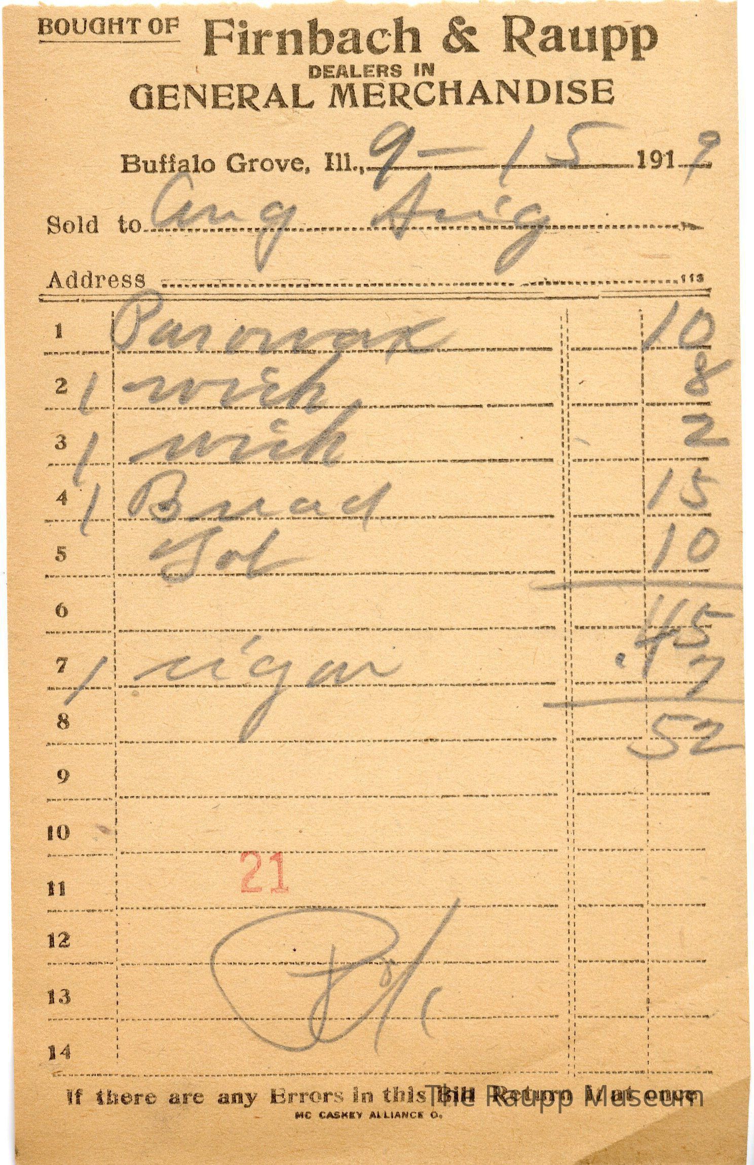 The black text is as follows, from top to bottom: Bought of Firnbach & Raupp; Dealers in GENERAL MERCHANDISE; Buffalo Grove, Ill.; Sold to; Address; If there are any Errors in this Bill Return it at once; MC CASKEY ALLIANCE O.Archive Details
