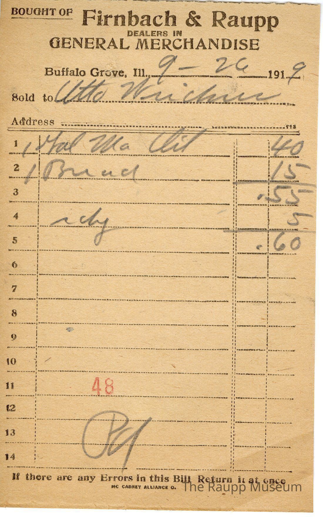The black text is as follows, from top to bottom: Bought of Firnbach & Raupp; Dealers in GENERAL MERCHANDISE; Buffalo Grove, Ill.; Sold to; Address; If there are any Errors in this Bill Return it at once; MCCASKEY ALLIANCE O.Archive Details