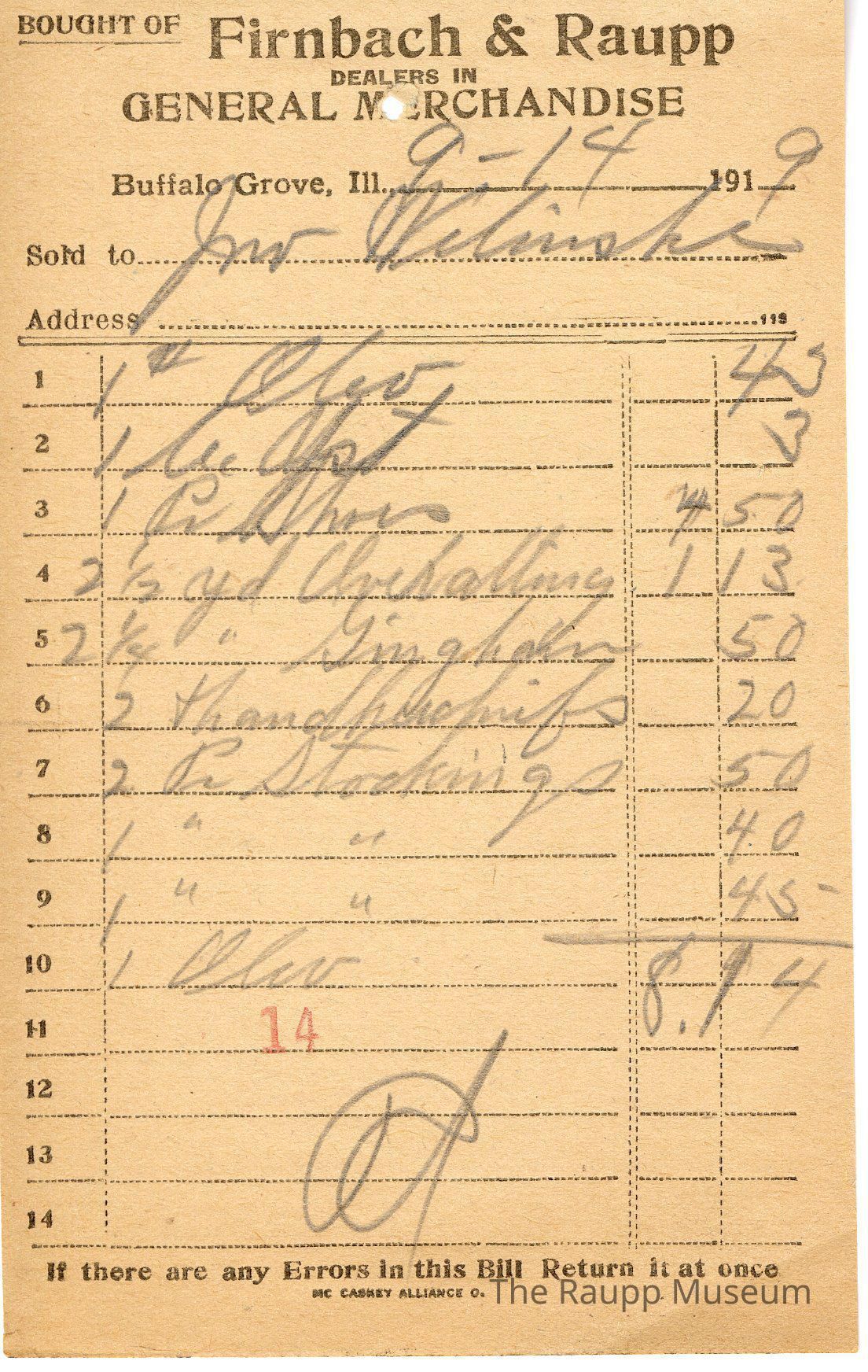The black text is as follows, from top to bottom: Bought of Firnbach & Raupp; Dealers in GENERAL MERCHANDISE; Buffalo Grove, Ill.; Sold to; Address; If there are any Errors in this Bill Return it at once; MCCASKEY ALLIANCE O.Archive Details