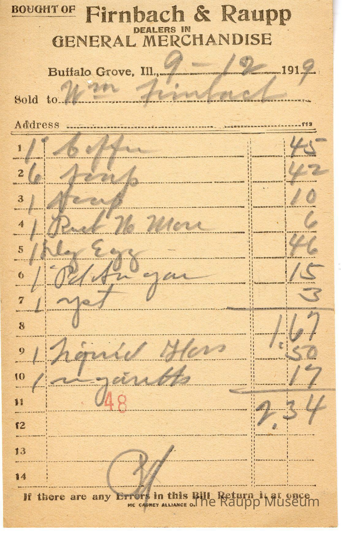 One (1) Firnbach and Raupp store receipt from September 12, 1919. Receipt is rectangular with black printed text and written notes in pencil. The receipt is for Wm. Firnbach, who bought one pound of coffee for $0.45, six soaps for $0.42, one soup for $0.10, one Reel No More (?) for $0.06, one (unit of) large eggs for $0.46, one pound of sugar for $0.15, one yeast for $0.03, one liquid glass for $0.50, and one ugainetts (?) for $0.17. Bill total is $2.34. There's a red stamp of 48 close to the bottom with the bill marked as paid.
