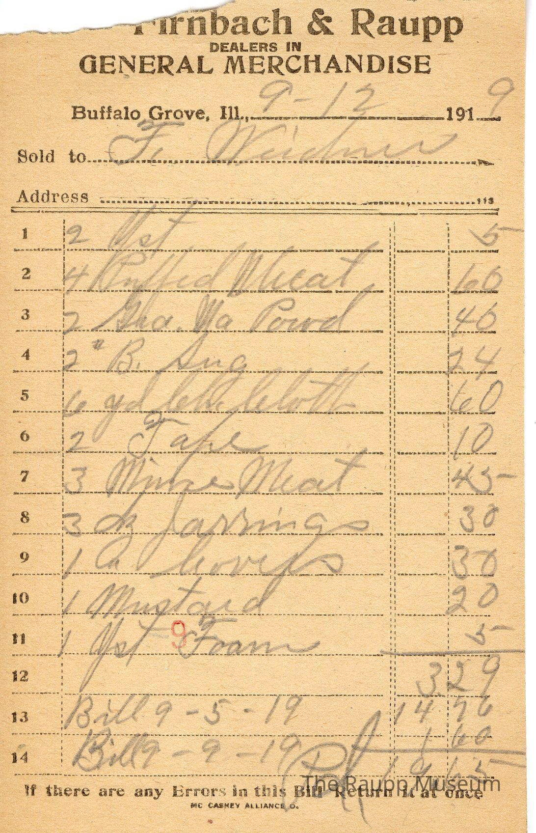 The black text is as follows, from top to bottom: Bought of Firnbach & Raupp; Dealers in GENERAL MERCHANDISE; Buffalo Grove, Ill.; Sold to; Address; If there are any Errors in this Bill Return it at once; MCCASKEY ALLIANCE O.Archive Details
