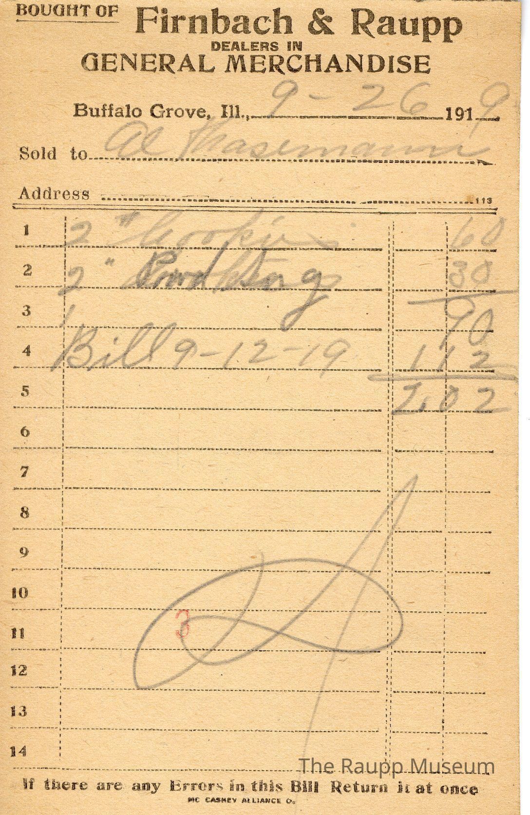 The black text is as follows, from top to bottom: Bought of Firnbach & Raupp; Dealers in GENERAL MERCHANDISE; Buffalo Grove, Ill.; Sold to; Address; If there are any Errors in this Bill Return it at once; MCCASKEY ALLIANCE O.Archive Details