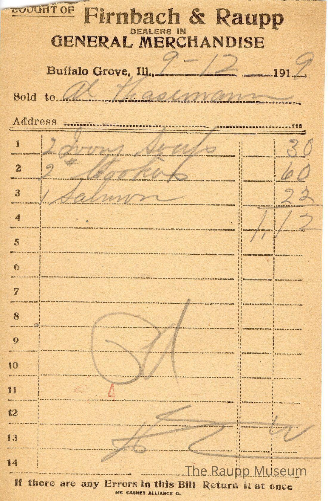 The black text is as follows, from top to bottom: Bought of Firnbach & Raupp; Dealers in GENERAL MERCHANDISE; Buffalo Grove, Ill.; Sold to; Address; If there are any Errors in this Bill Return it at once; MCCASKEY ALLIANCE O.Archive Details