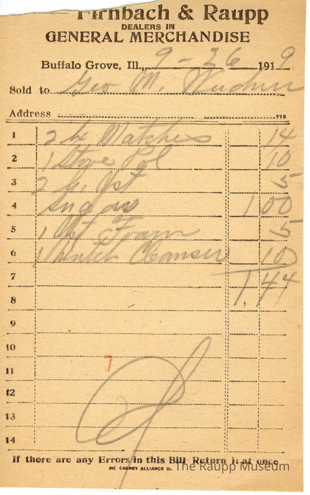 The black text is as follows, from top to bottom: Bought of Firnbach & Raupp; Dealers in GENERAL MERCHANDISE; Buffalo Grove, Ill.; Sold to; Address; If there are any Errors in this Bill Return it at once; MCCASKEY ALLIANCE O.Archive Details