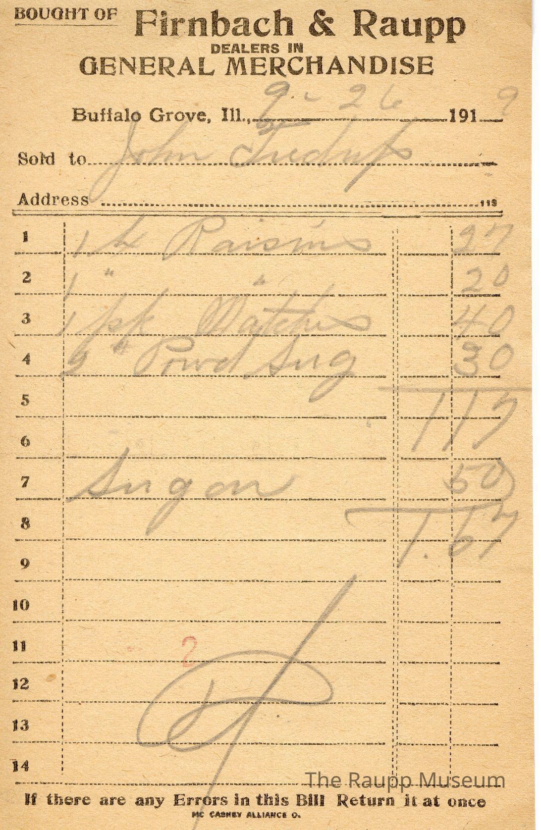 The black text is as follows, from top to bottom: Bought of Firnbach & Raupp; Dealers in GENERAL MERCHANDISE; Buffalo Grove, Ill.; Sold to; Address; If there are any Errors in this Bill Return it at once; MCCASKEY ALLIANCE O.Archive Details