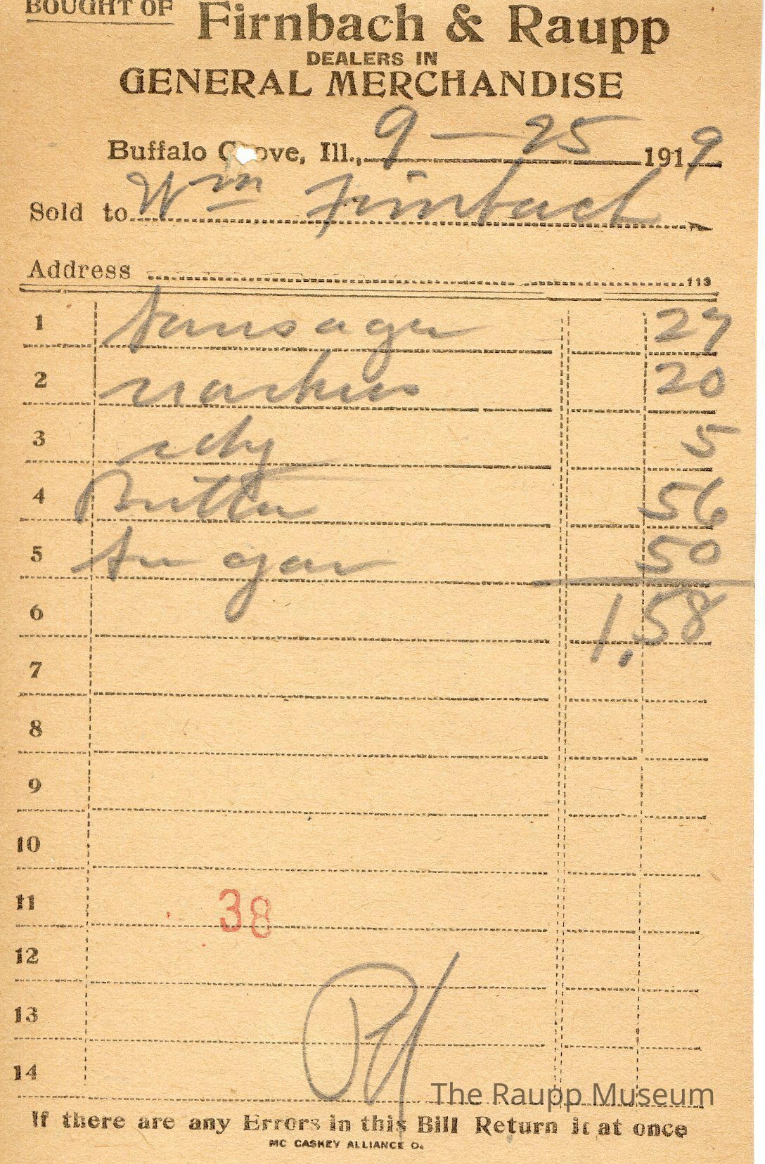 One (1) Firnbach and Raupp store receipt from September 25, 1919. Receipt is rectangular with black printed text and written notes in pencil. The receipt is for Wm. Firnbach, who bought sausage for $0.27, crackers for $0.20, echy (?) for $0.05, butter for $0.56, and sugar $0.50. Bill total is $1.58. There is a red stamp of 38 close to the bottom with the receipt marked as paid.