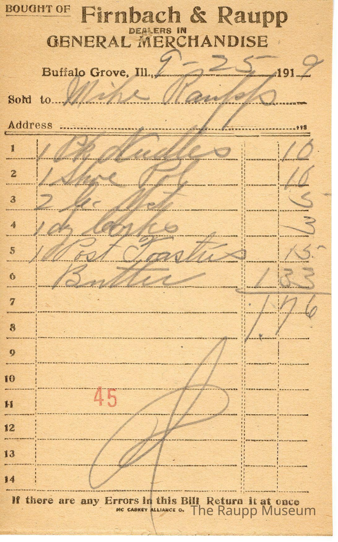 One (1) Firnbach and Raupp store receipt from September 25, 1919. Receipt is rectangular with black printed text and written notes in pencil. The receipt is for Mike Raupp, who bought one pack of needles for $0.10, one shoe polish for $0.10, two b. yeast for $0.05, one dozen corks for $0.03, one Post Toasties for $0.15, and butter for $1.33. Bill total is $1.76. There is a red stamp of 45 close to the bottom with the receipt marked as paid.