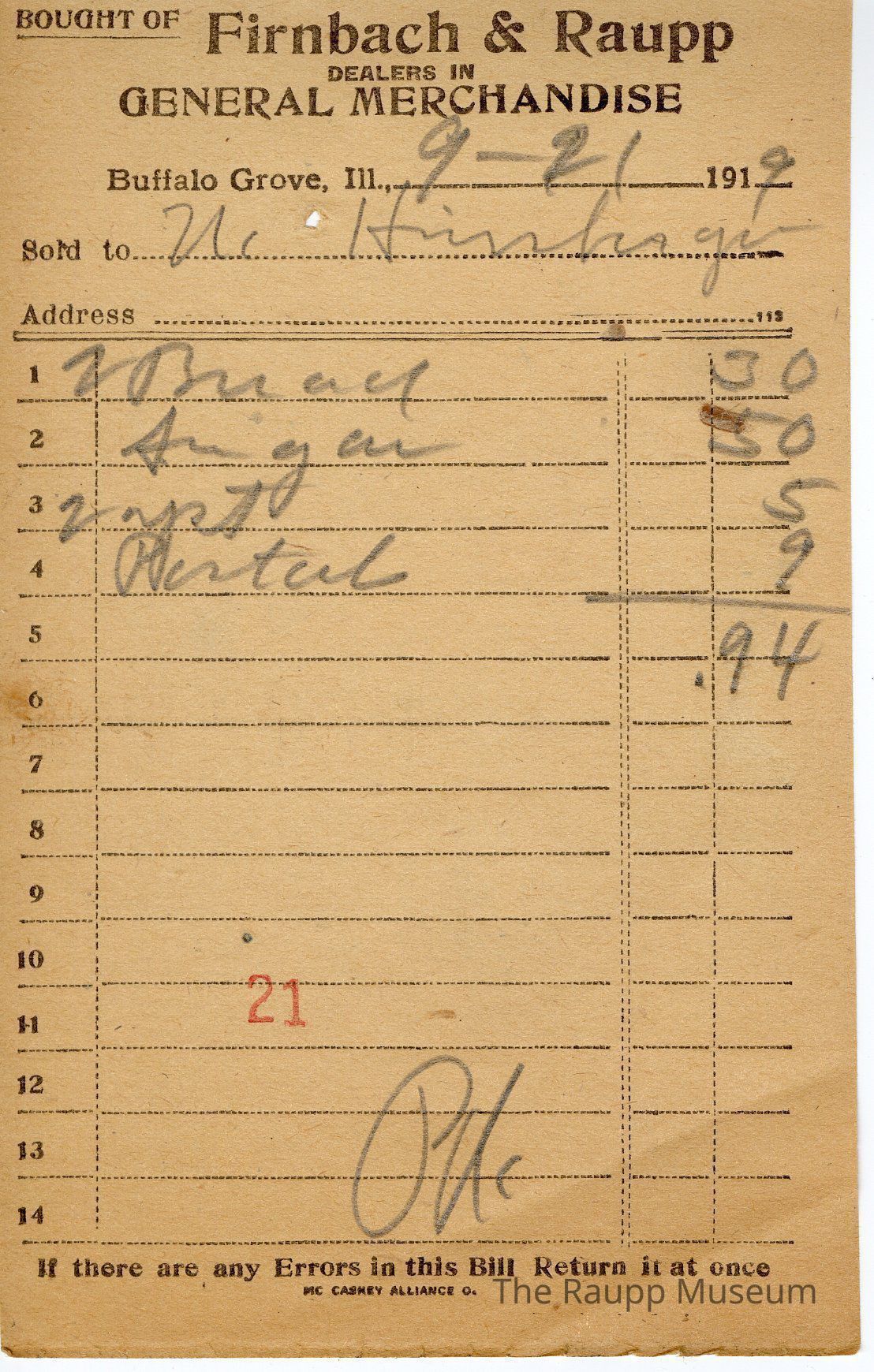 One (1) Firnbach and Raupp store receipt from September 21, 1919. Receipt is rectangular with black printed text and written notes in pencil. The receipt is for N. Hinheger (?), who bought two breads for $0.30, sugar for $0.50, two yeast for $0.05, and postal (?) for $0.09. Bill total is $0.94. There is a red stamp of 21 close to the bottom with the receipt marked as paid.
