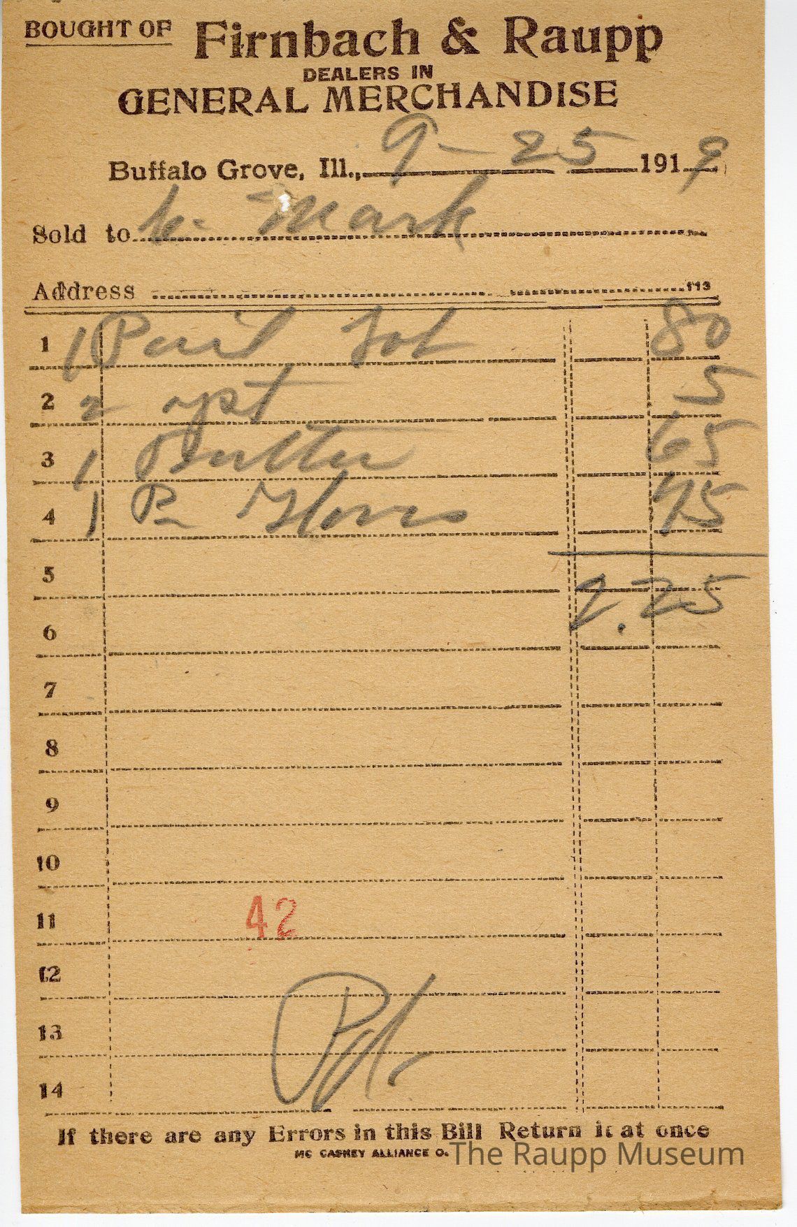 One (1) Firnbach and Raupp store receipt from September 25, 1919. Receipt is rectangular with black printed text and written notes in pencil. The receipt is for B. Mark, who bought one pail jal for $0.80, two yeast for $0.05, one butter for $0.65, and one pair of gloves for $0.75. Bill total is $2.25. There is a red stamp of 42 close to the bottom with the receipt marked as paid.