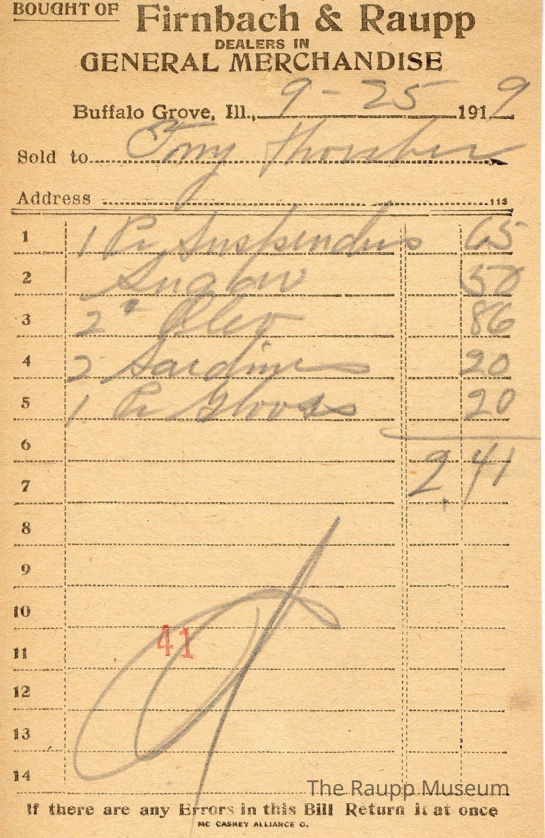 One (1) Firnbach and Raupp store receipt from September 25, 1919. Receipt is rectangular with black printed text and written notes in pencil. The receipt is for Tony Thorcker (?), who bought one pair of suspenders for $0.65, sugar for $0.30, two pounds of oleo for $0.86, two sardines for $0.20, and one pair of gloves for $0.20. Bill total is $2.41. There is a red stamp of 41 close to the bottom with the receipt marked as paid.