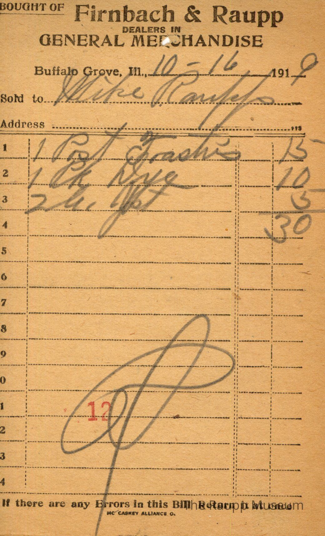 One (1) Firnbach and Raupp store receipt from October 16, 1919. Receipt is rectangular with black printed text and written notes in pencil. The receipt is for Mike Raupp, who bought one Post Toasties for $0.15, one pack of dye for $0.10, and two b. yeast for $0.05. The total is $0.30 and the receipt is marked as paid. A red stamp of 12 is located towards the bottom of the page. The text from top to bottom is: BOUGHT OF Firnbach & Raupp; DEALERS IN GENERAL MERCHANDISE; Buffalo Grove, Ill.; Sold to; Address; If there are any Errors in this Bill Return It at once; MC CASKEY ALLIANCE O.Archive Details