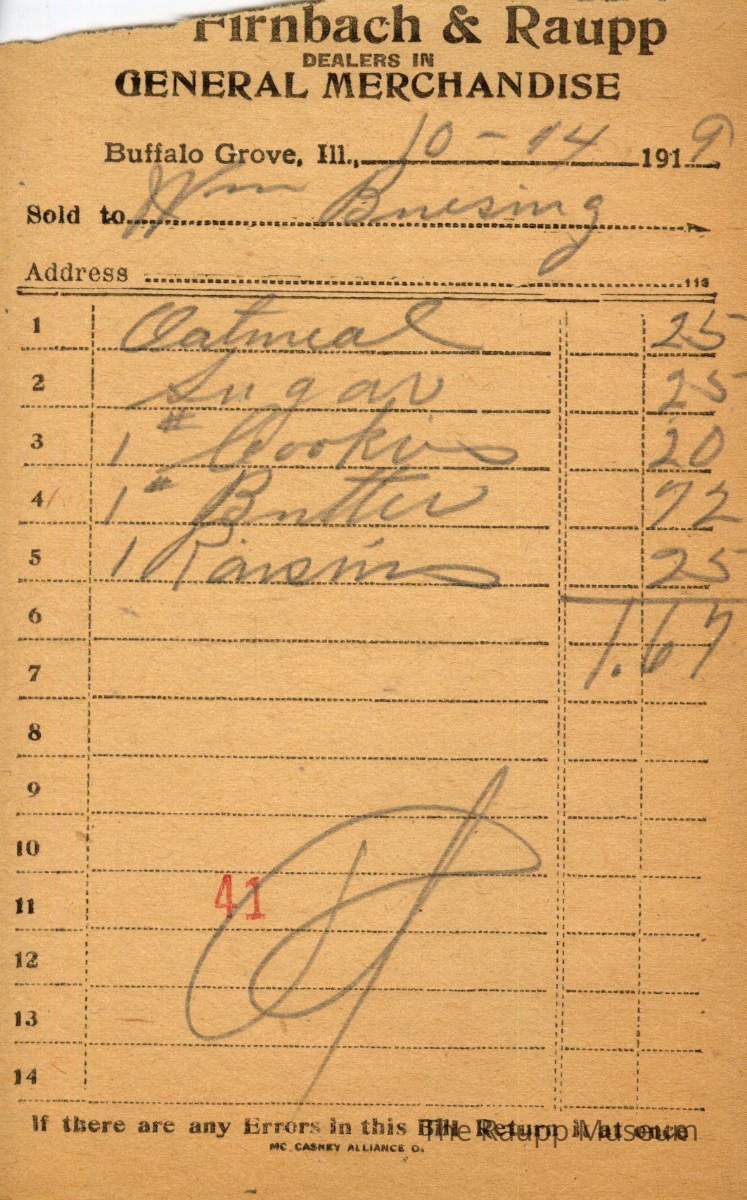 One (1) Firnbach and Raupp store receipt from October 14, 1919. Receipt is rectangular with black printed text and written notes in pencil. The receipt is for Wm Buesing, who bought oatmeal for $0.25, sugar for $0.25, one pound of cookies for $0.20, one pound of butter for $0.72, and one raisins for $0.25. The total is $1.67 and the receipt is marked as paid. A red stamp of 41 is located towards the bottom of the page. The text from top to bottom is: BOUGHT OF Firnbach & Raupp; DEALERS IN GENERAL MERCHANDISE; Buffalo Grove, Ill.; Sold to; Address; If there are any Errors in this Bill Return It at once; MC CASKEY ALLIANCE O.Archive Details