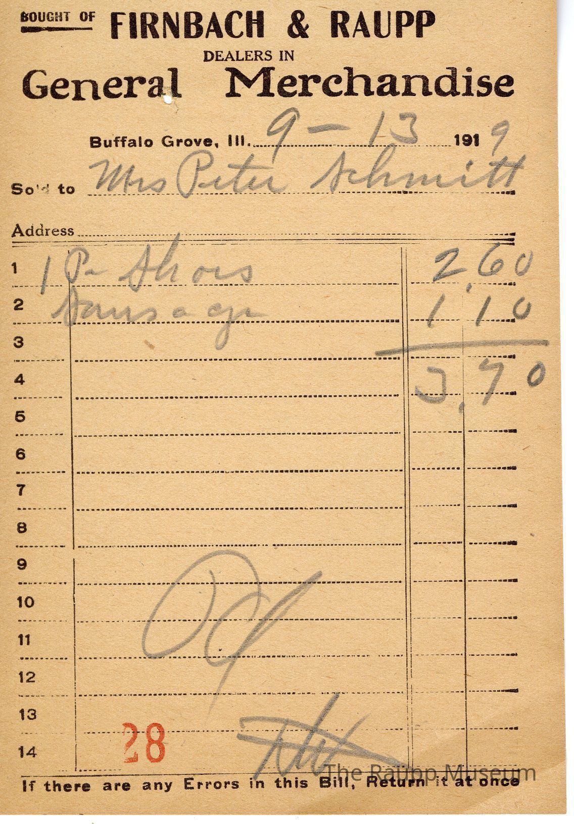 One (1) Firnbach and Raupp store receipt from September 13, 1919. Receipt is rectangular with black printed text and written notes in pencil. The receipt is for Mrs. Peter Schmitt, who bought one pair of shoes for $2.60 and jam a ga (?) for $1.10. The bill total is $3.70. There's a red stamp of 28 towards the bottom and the bill is marked as paid.