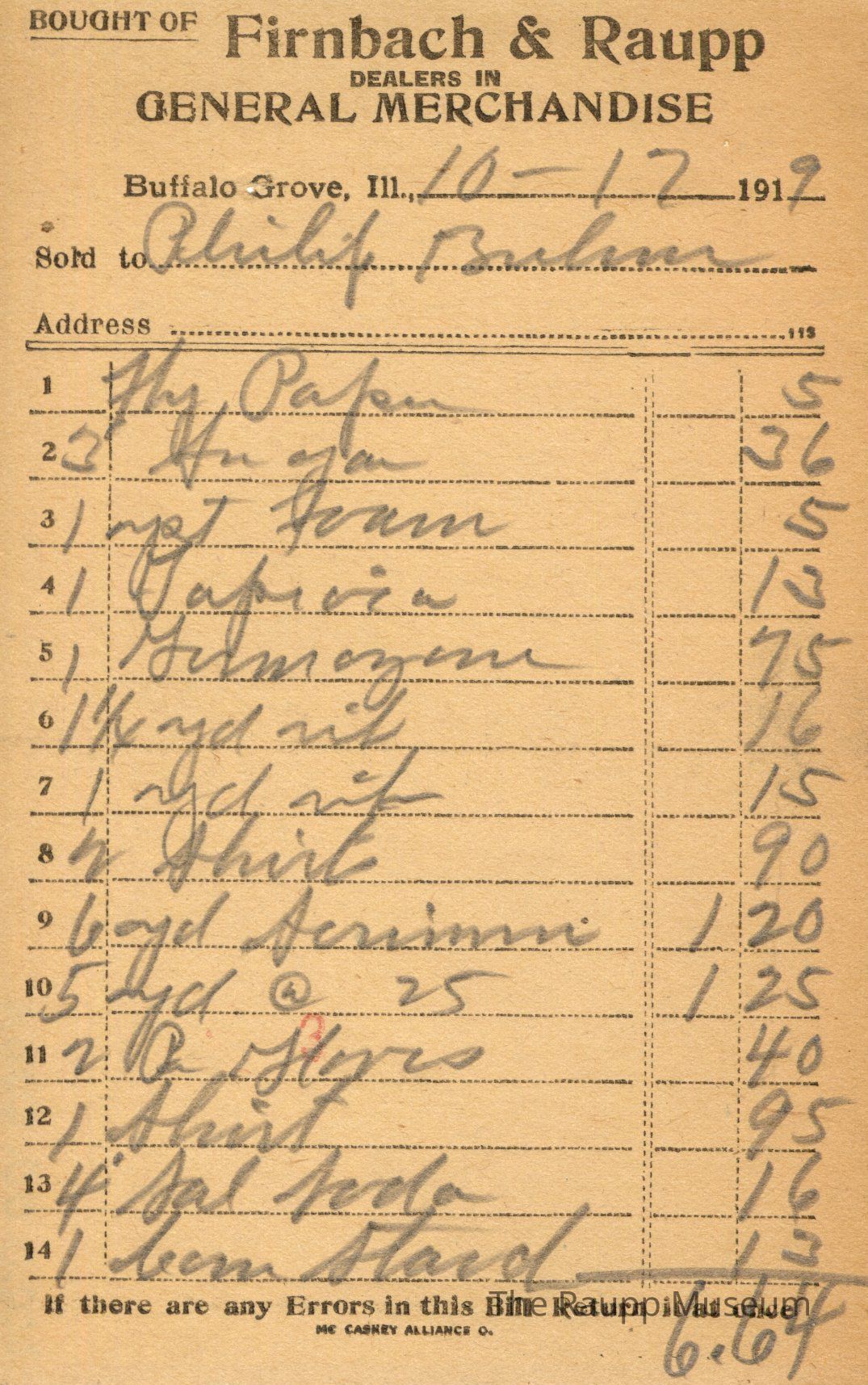 One (1) Firnbach and Raupp store receipt from October 17, 1919. Receipt is rectangular with black printed text and written notes in pencil. The receipt is for Philip Brehm, who bought ply paper for $0.05, three pounds of sugar for $0.36, one yeast foam for $0.05, one tapioca for $0.13, one gemagane (?) for $0.75, one and one-quarter yards of vil (?) for $0.16, one yard of vil for $0.15, two shirts for $0.90, six yards of seninm (?) for $1.20, five yards at $0.25 for $1.25 (unknown item), two pairs of gloves for $0.40, one shirt for $0.95, four gallons of soda for $0.16, and one corn starch for $0.13. The total is $6.64. A red stamp of 3 is located towards the bottom of the page. The text from top to bottom is: BOUGHT OF Firnbach & Raupp; DEALERS IN GENERAL MERCHANDISE; Buffalo Grove, Ill.; Sold to; Address; If there are any Errors in this Bill Return It at once; MC CASKEY ALLIANCE O.Archive Details