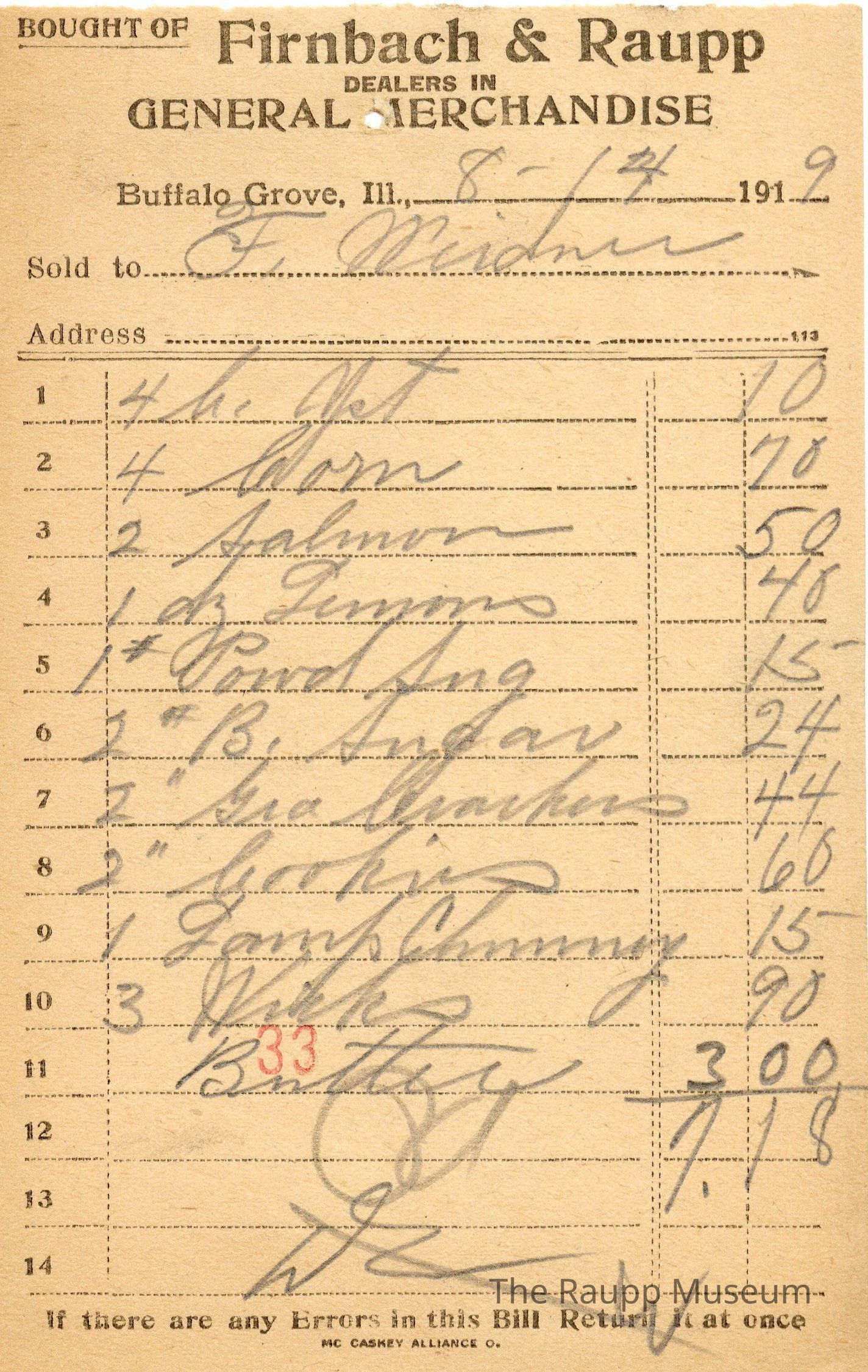 The black text is as follows, from top to bottom: Bought of Firnbach & Raupp; Dealers in GENERAL MERCHANDISE; Buffalo Grove, Ill.; Sold to; Address; If there are any Errors in this Bill Return it at once; MCCASKEY ALLIANCE O.Archive Details