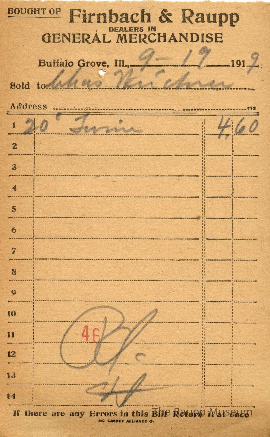 One (1) Firnbach and Raupp store receipt from September 19 1919. Receipt is for C. Weidner, and has one (1) items purchased. Purchased item is twenty (20) ft of twine. Total was $4.60. Receipt is rectangular, with both printed and handwritten text. On the top is printed "Firnbach & Raupp Dealers In General Merchandise." PD is handwritten on the bottom, and a red number 46 is stamped on the center bottom.Archive Details