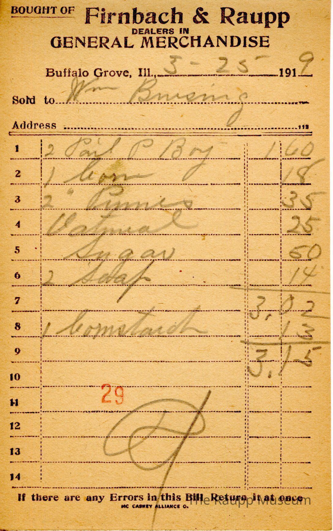 The black printed text is as follows, from top to bottom: Bought of Firnbach & Raupp; Dealers in GENERAL MERCHANDISE; Buffalo Gove. Ill, 191; Sold to; If there are any errors in this Bill Return it at once; MC CASKEY ALLIANCE O.Archive Details