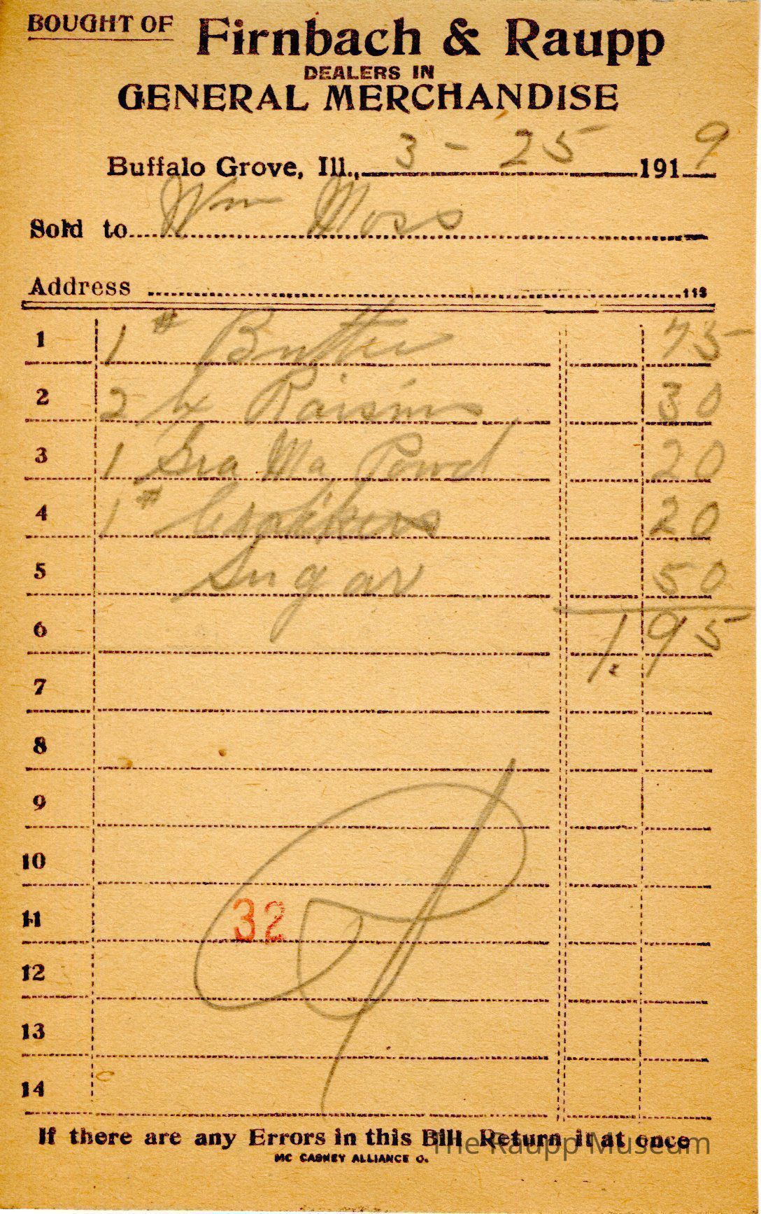 The black printed text is as follows, from top to bottom: Bought of Firnbach & Raupp; Dealers in GENERAL MERCHANDISE; Buffalo Gove. Ill, 191; Sold to; If there are any errors in this Bill Return it at once; MC CASKEY ALLIANCE O.Archive Details