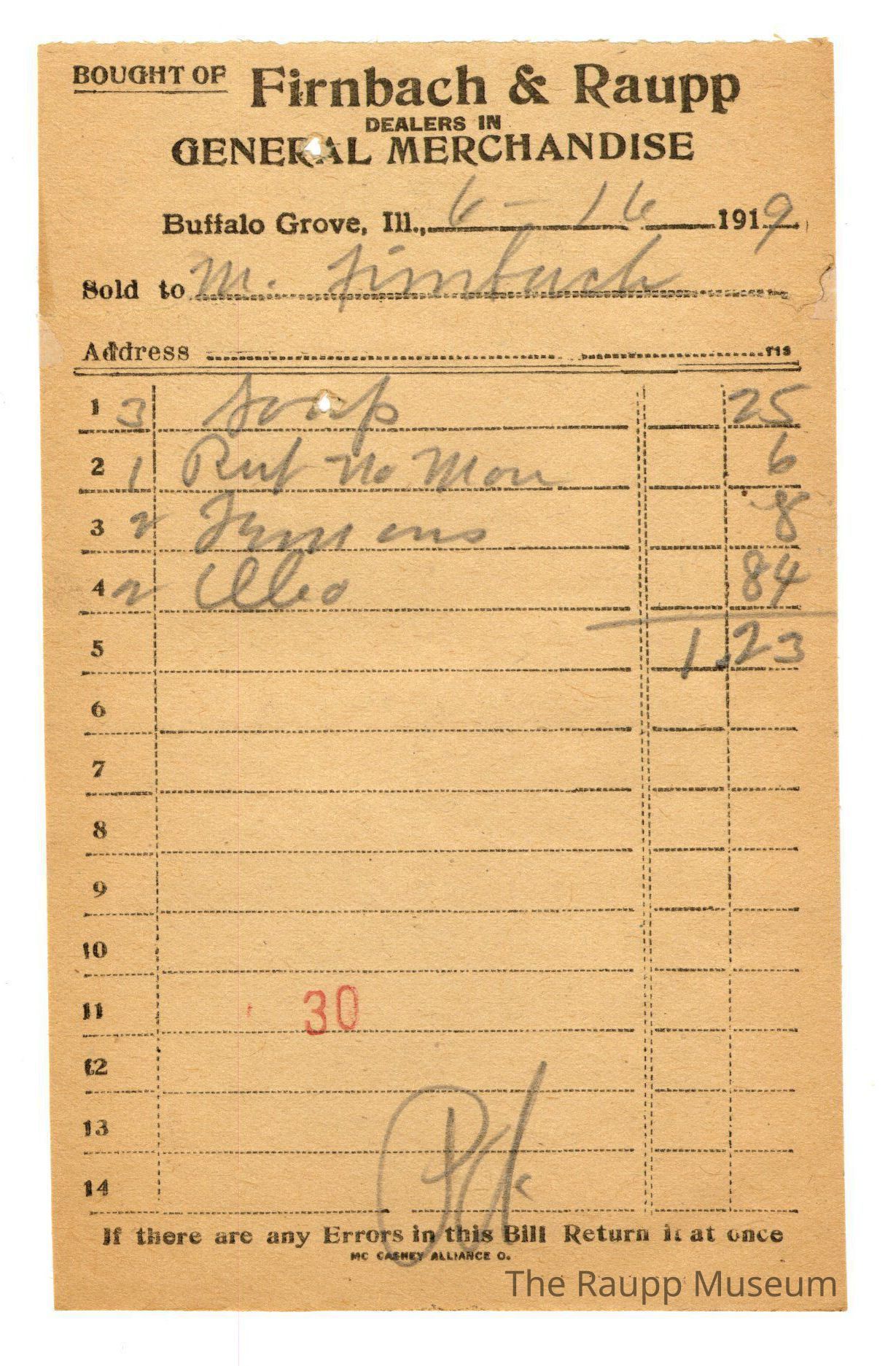 One (1) Firnbach and Raupp store receipt from June 16, 1919. Receipt is rectangular with black printed text and written notes in pencil. The receipt is for M. Firnbach, who bought three soap for $0.25, one Rub No More for $0.06, two lemons for $0.08, and two oleo for $0.23. Bill total was $1.23. There's a red stamp of 30 close to the bottom, with the bill marked as paid (written as "Pd.").