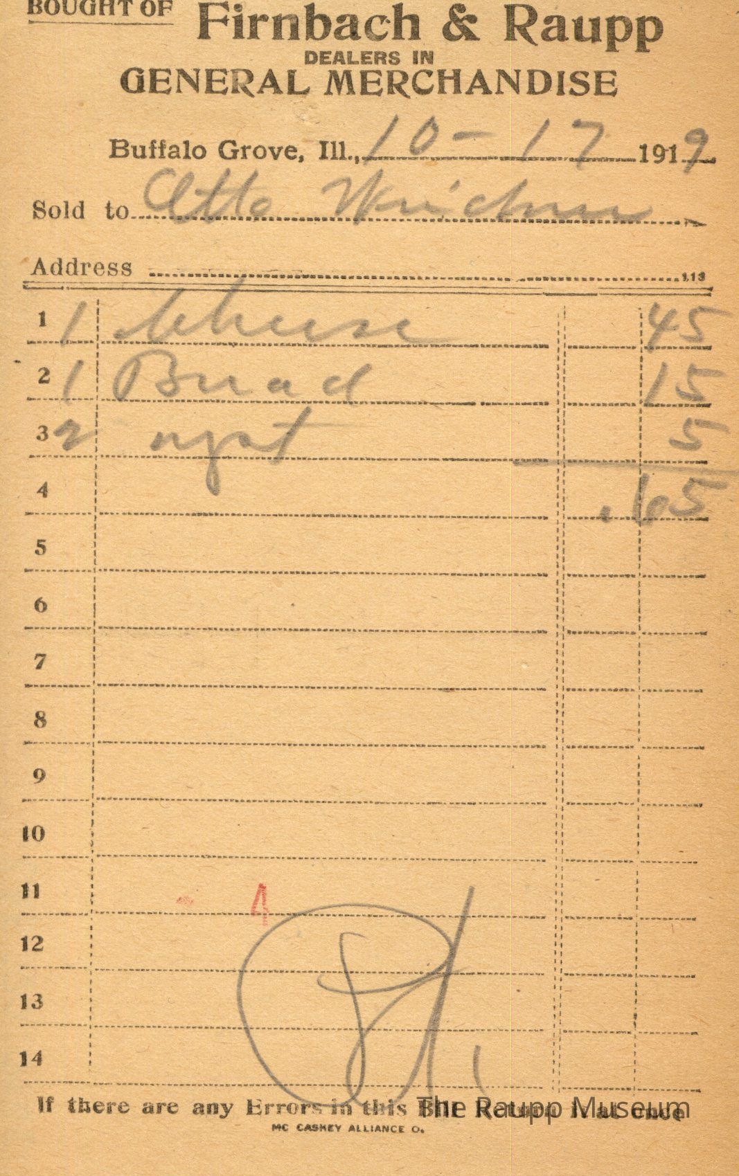 One (1) Firnbach and Raupp store receipt from October 17, 1919. Receipt is rectangular with black printed text and written notes in pencil. The receipt is for Otto Weidner, who bought one cheese for $0.45, one bread for $0.15, and two yeast for $0.05. The total is $0.65. A red stamp of 4 is located towards the bottom of the page and the receipt is marked as paid. The text from top to bottom is: BOUGHT OF Firnbach & Raupp; DEALERS IN GENERAL MERCHANDISE; Buffalo Grove, Ill.; Sold to; Address; If there are any Errors in this Bill Return It at once; MC CASKEY ALLIANCE O.Archive Details